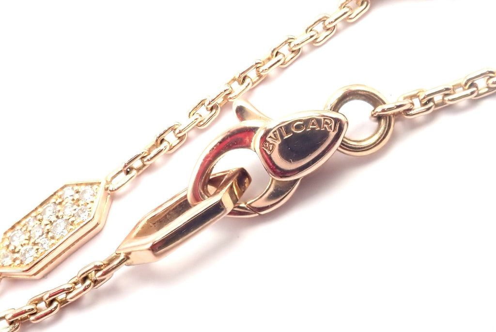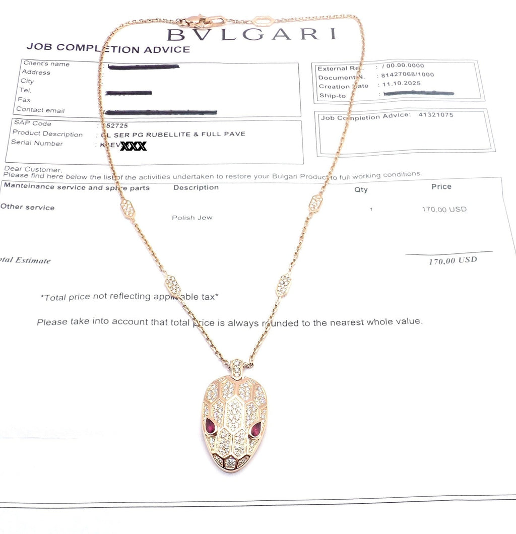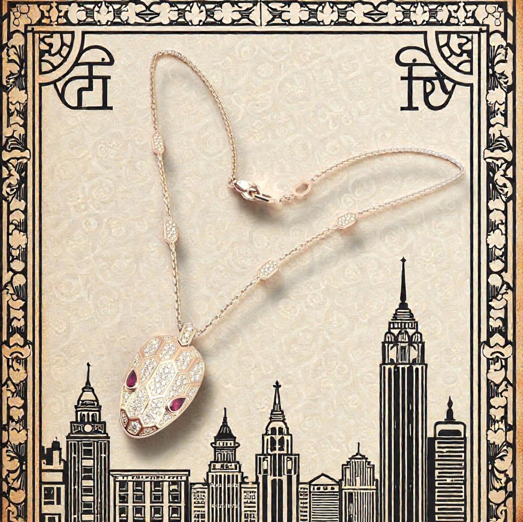The Bulgari Serpenti necklace in 18k rose gold features a serpent head pendant adorned with pavé diamonds and vivid rubellite gemstone eyes.