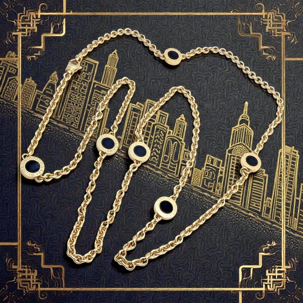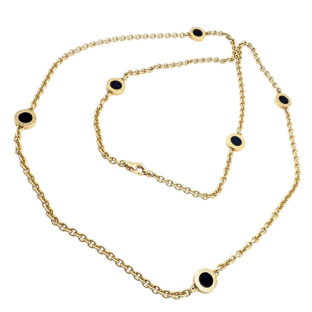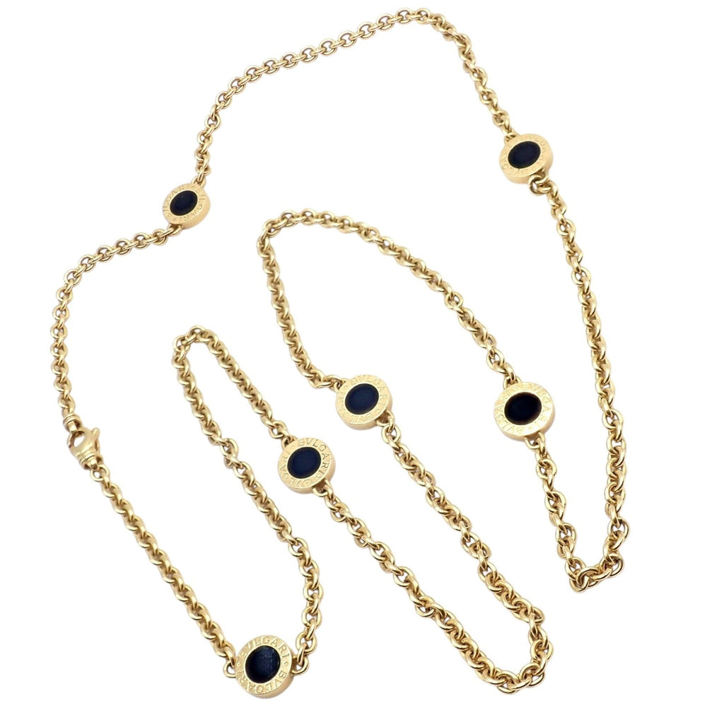Elegant Bvlgari Bulgari long necklace in luminous 18k rose gold, featuring signature circular stations set with glossy black onyx.
