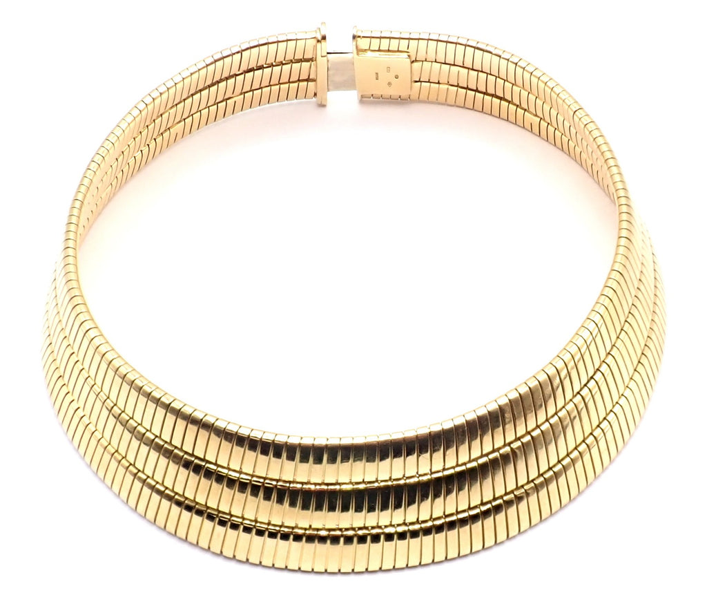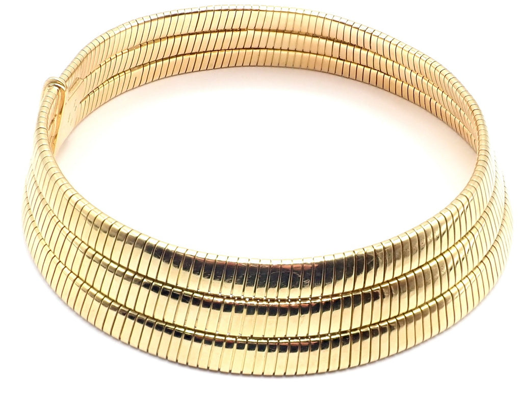The Bvlgari Bulgari Three Rows Tubogas 18k Yellow Gold Choker Necklace features the brand’s iconic flexible, coiled design, inspired by ancient Roman architecture.
