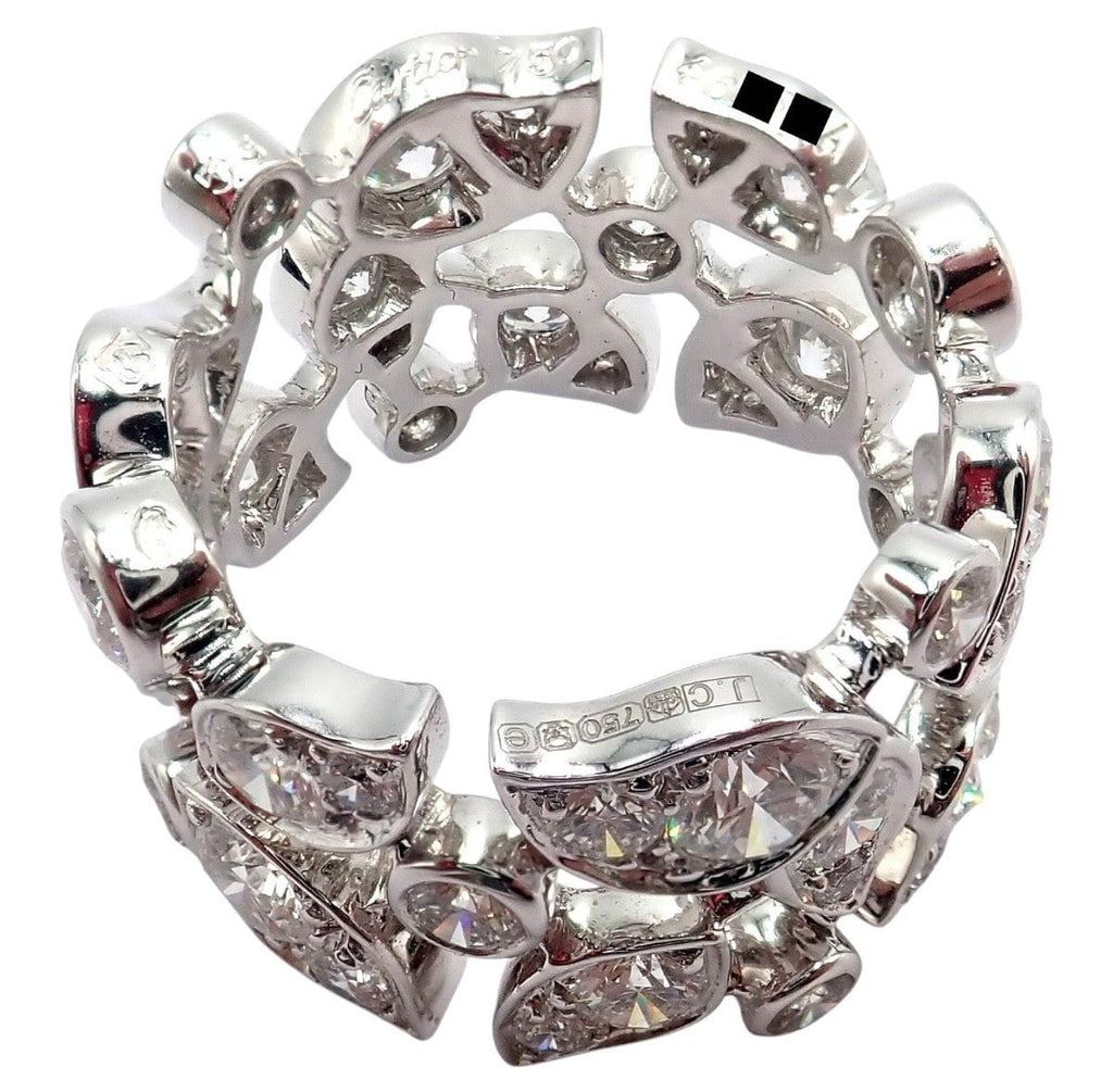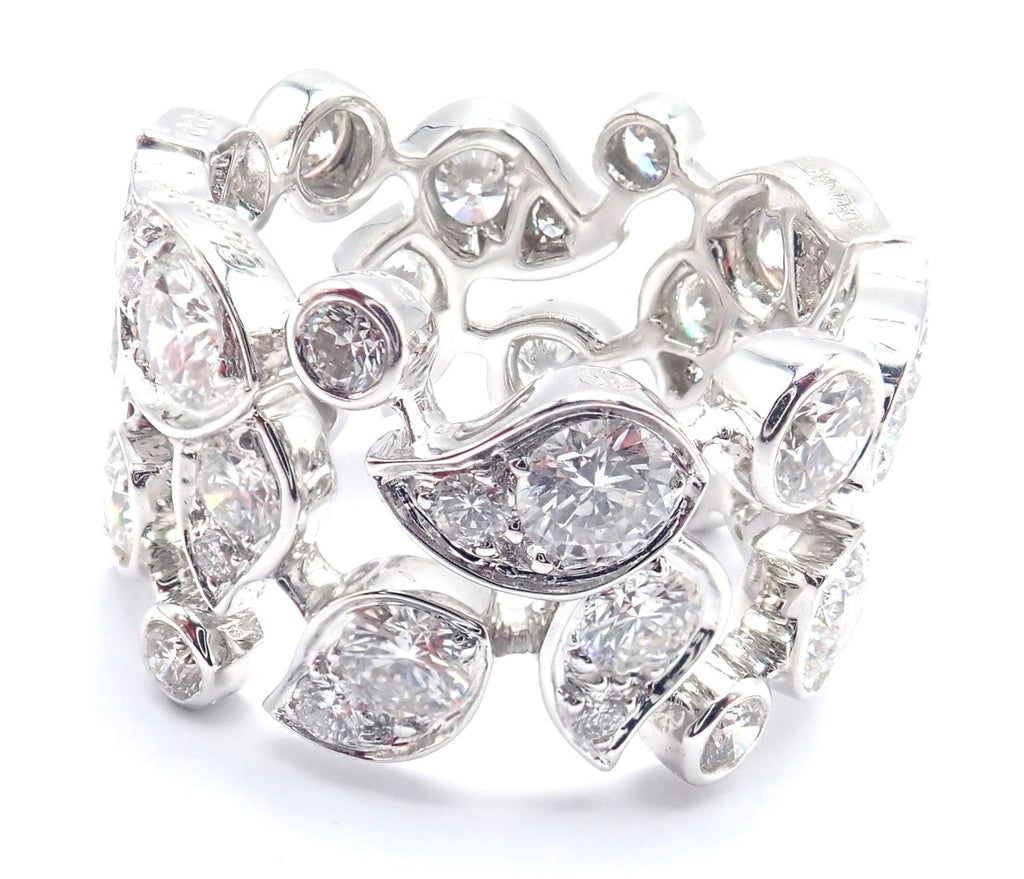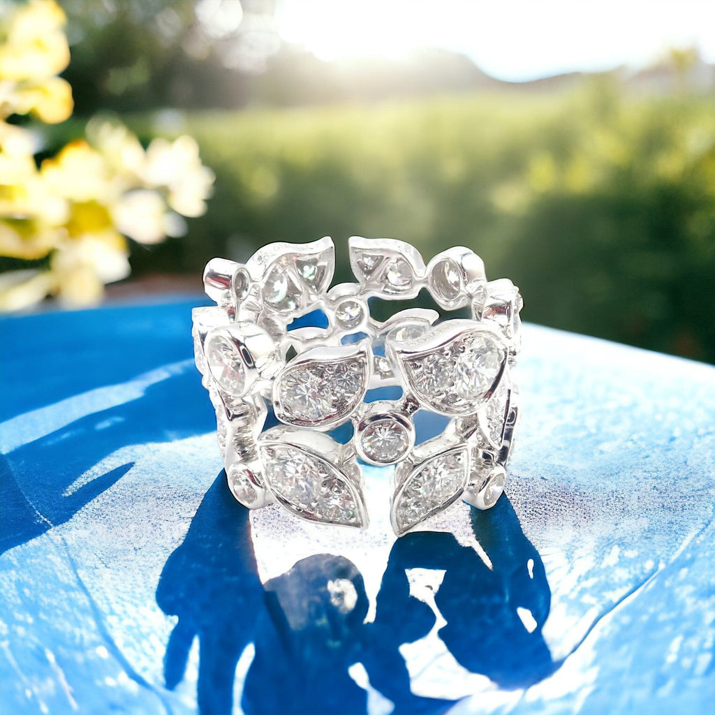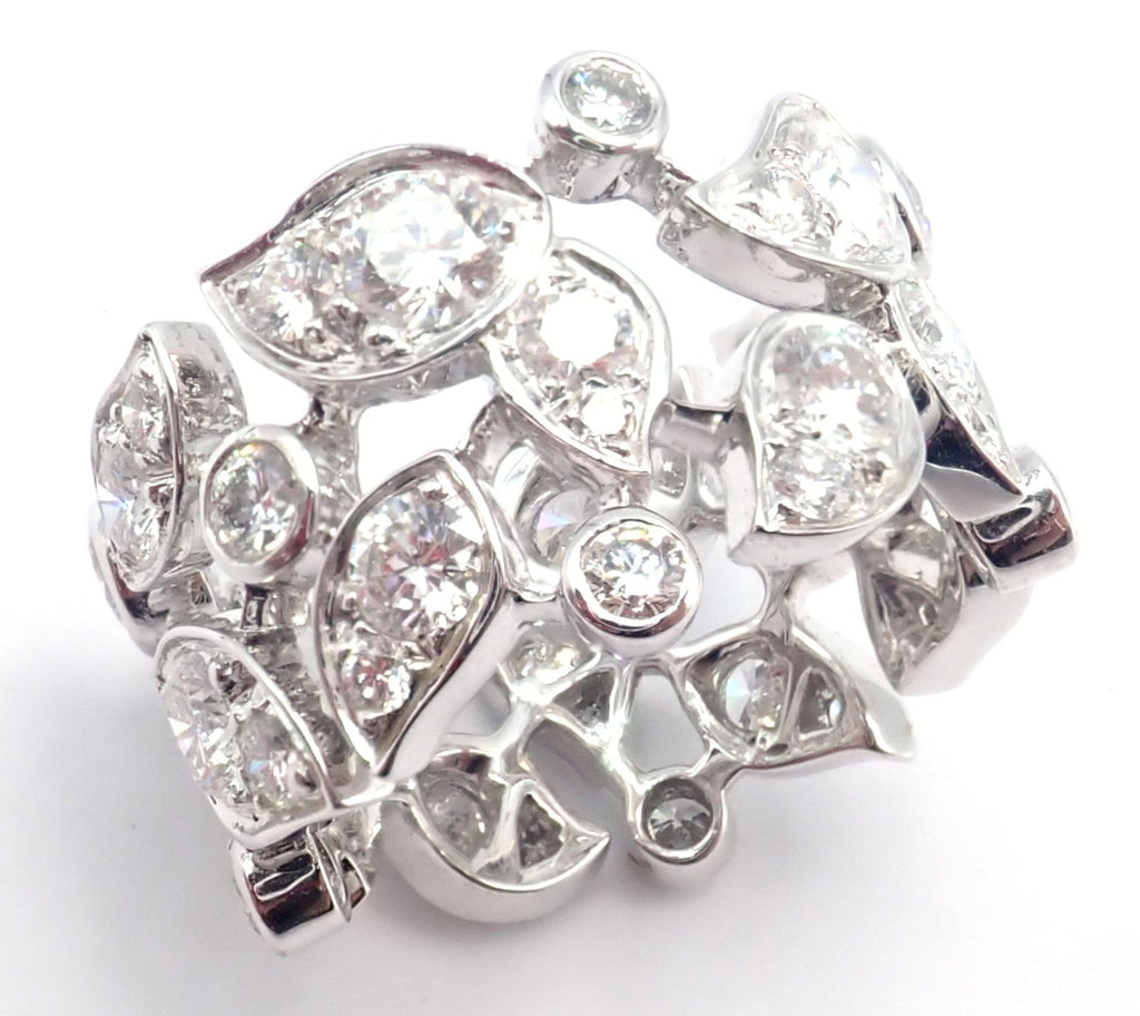 The Cartier 18k White Gold Diamond Leaf Wide Band Ring, size 53, showcases an elegant leaf pattern encrusted with sparkling diamonds.