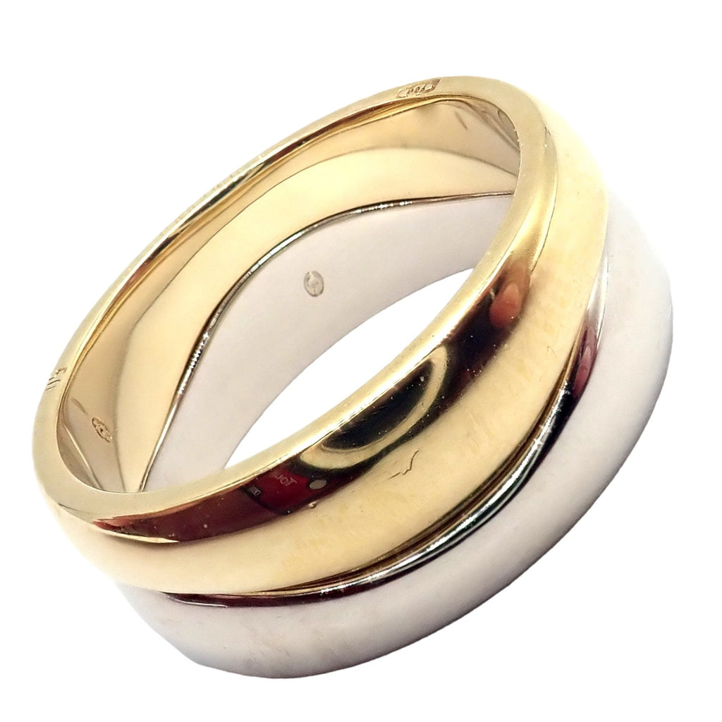 The Cartier 18k Yellow and White Gold Two Stacking Puzzle Band Ring features an innovative puzzle piece design that seamlessly interlocks two bands—one in polished yellow gold and the other in white gold.