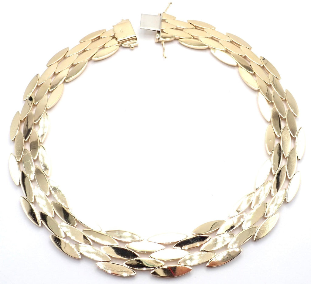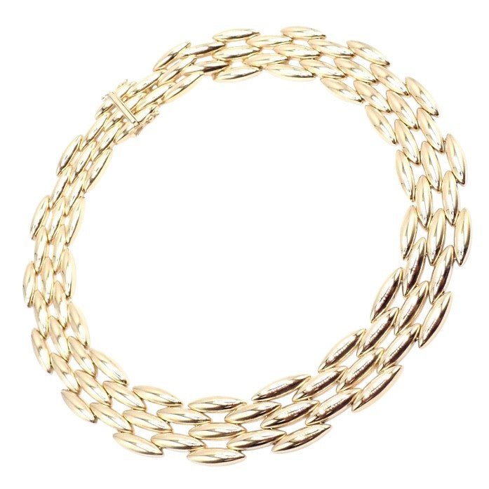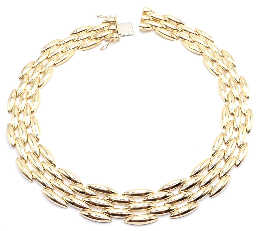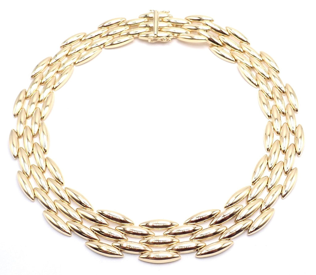 This authentic Cartier Gentiane necklace features five luxurious rows of 18k yellow gold rice-shaped links in a bold, wide design.