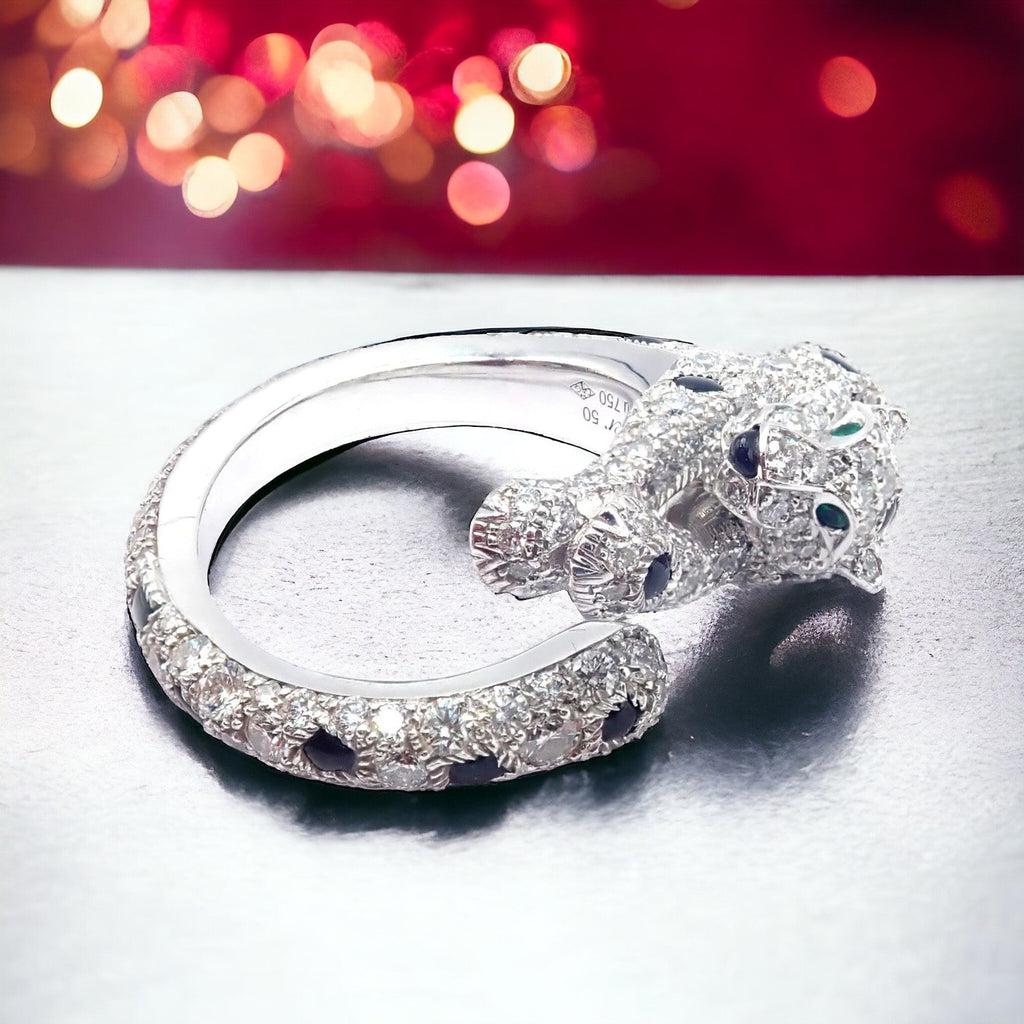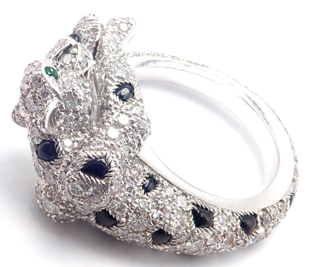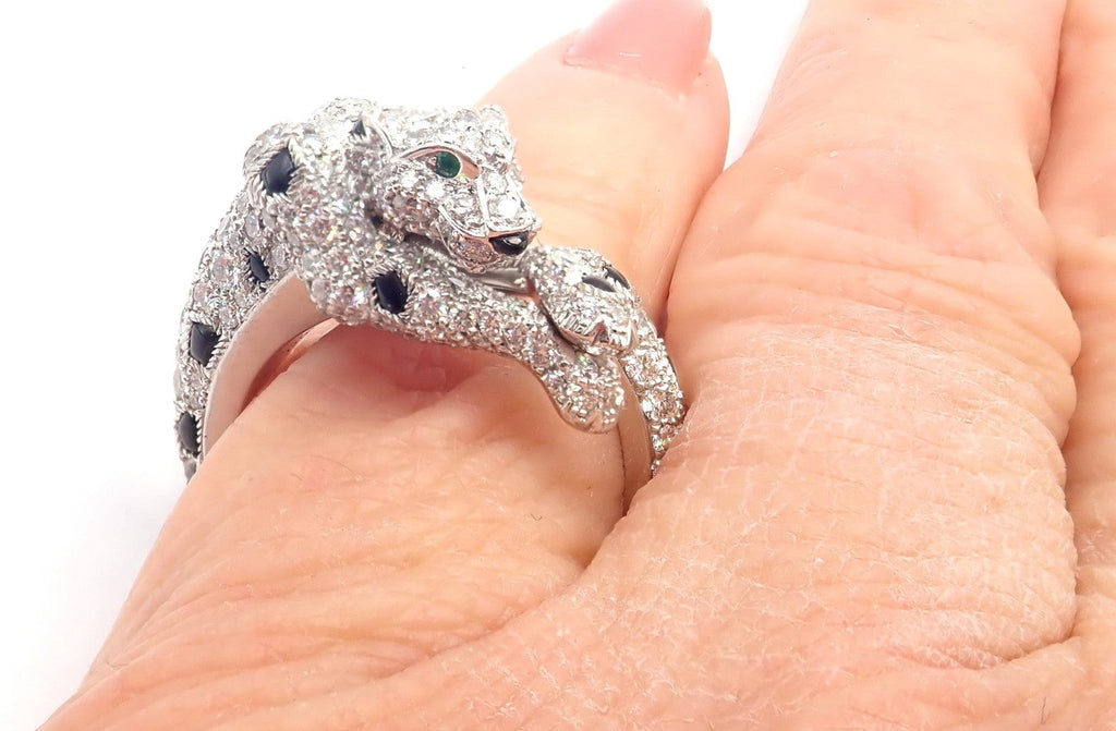 The Authentic Cartier Panther Panthere ring is an exquisite piece of jewelry crafted from 18k white gold. It features a striking panther design, adorned with sparkling diamonds and deep black onyx accents.