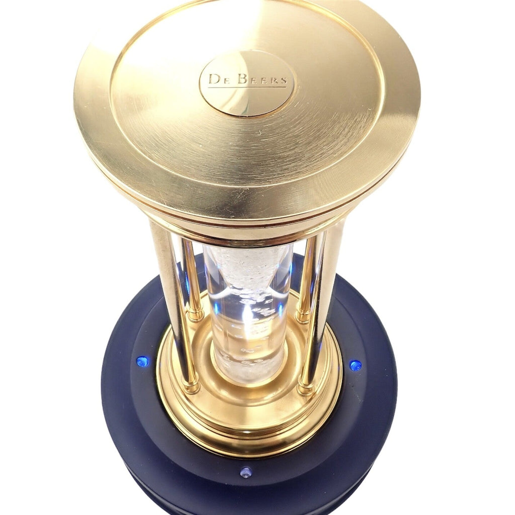 Containing a cascade of over 2000 natural rough diamonds, weighing approximately 36 carats, suspended in a silicone fluid contained in a brass and acrylic reversible timer, duration approximately ten minutes, with battery operated illuminated stand, inside base is numbered out of 2000