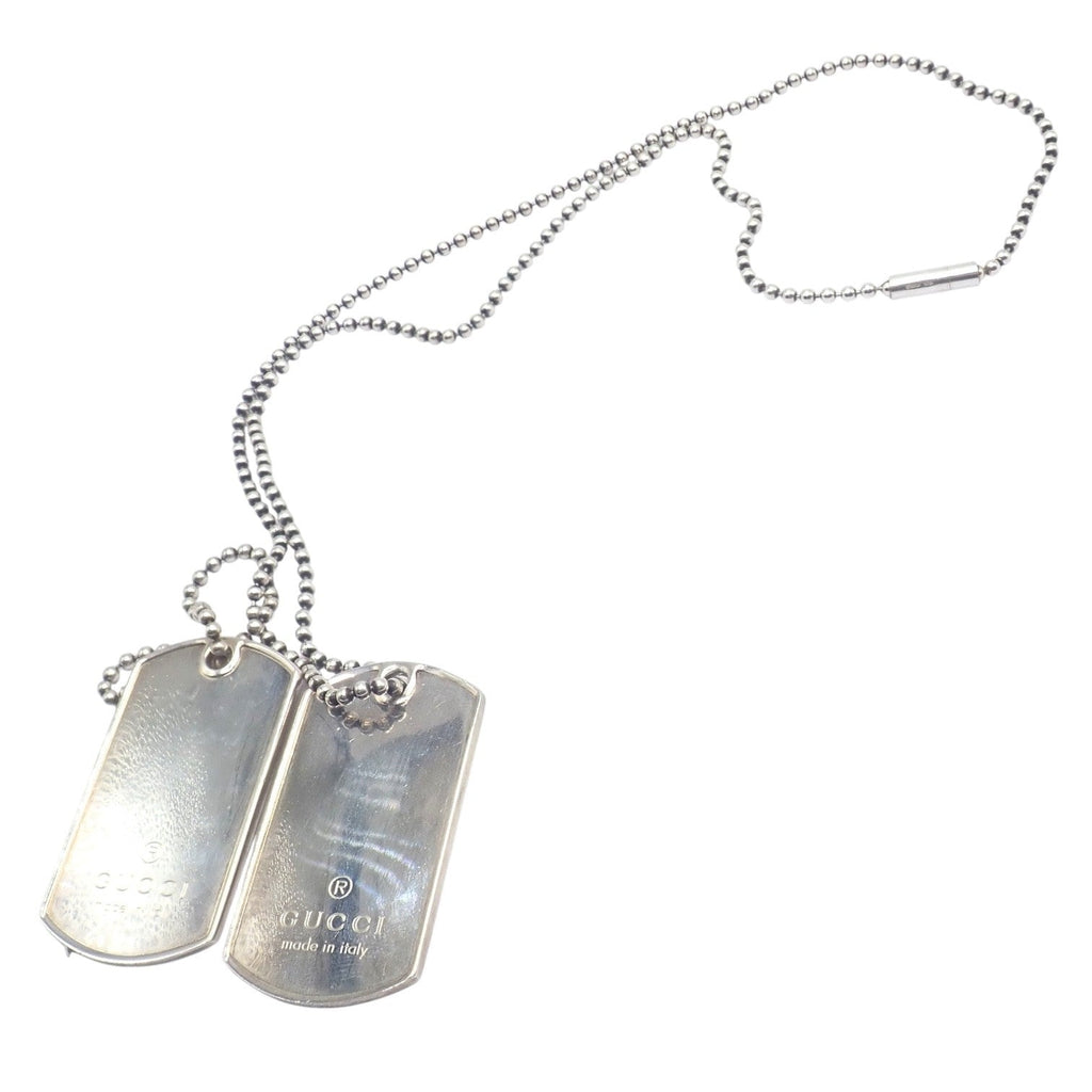 Stylish Gucci Sterling Silver Double Dog Tag Necklace featuring two polished tags engraved with the Gucci logo and “made in Italy.”