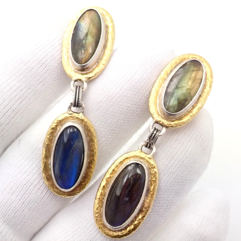 The combination of the intricate craftsmanship, precious metals, and the mesmerizing labradorite stones creates a luxurious and eye-catching accessory that adds elegance to any outfit.