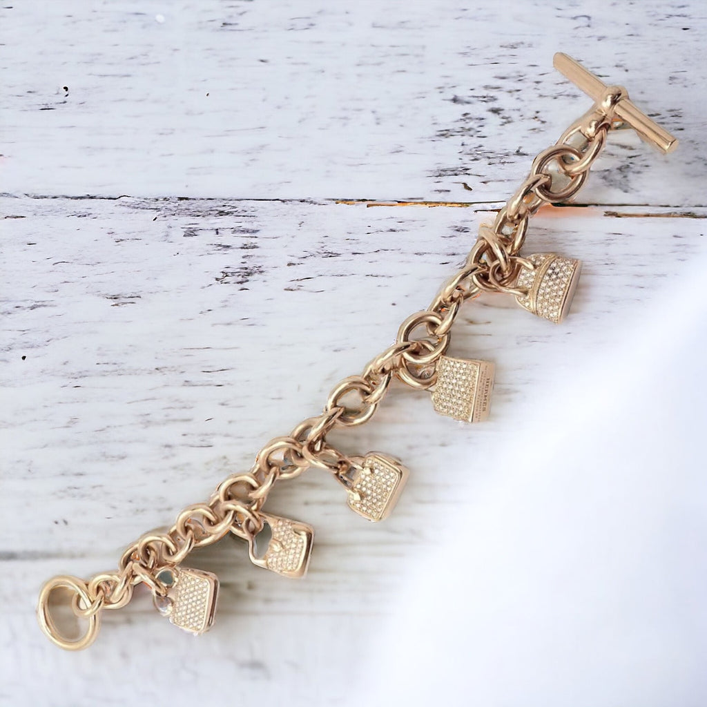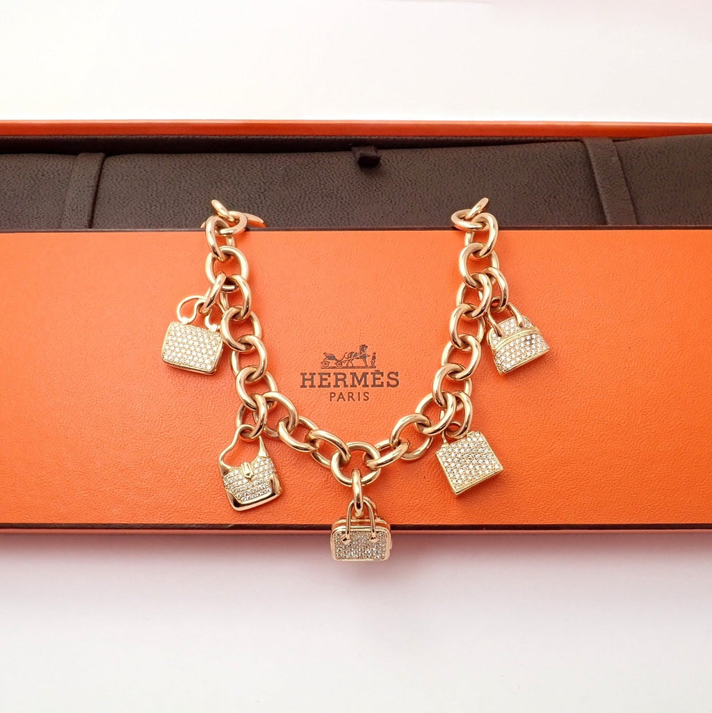 The Hermes 18k Rose Gold Diamond Signature Iconic Bag Charm Link Bracelet is an exquisite piece of jewelry, featuring a luxurious 18-karat rose gold construction.
