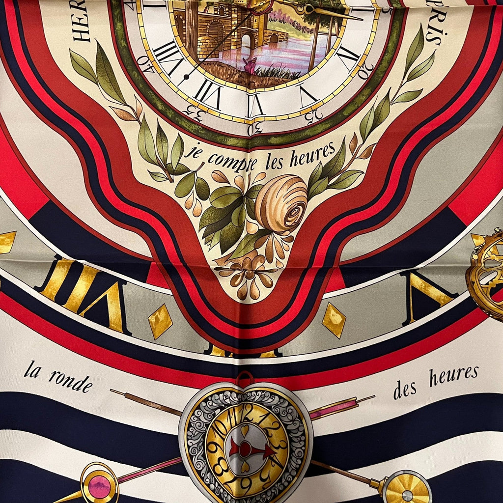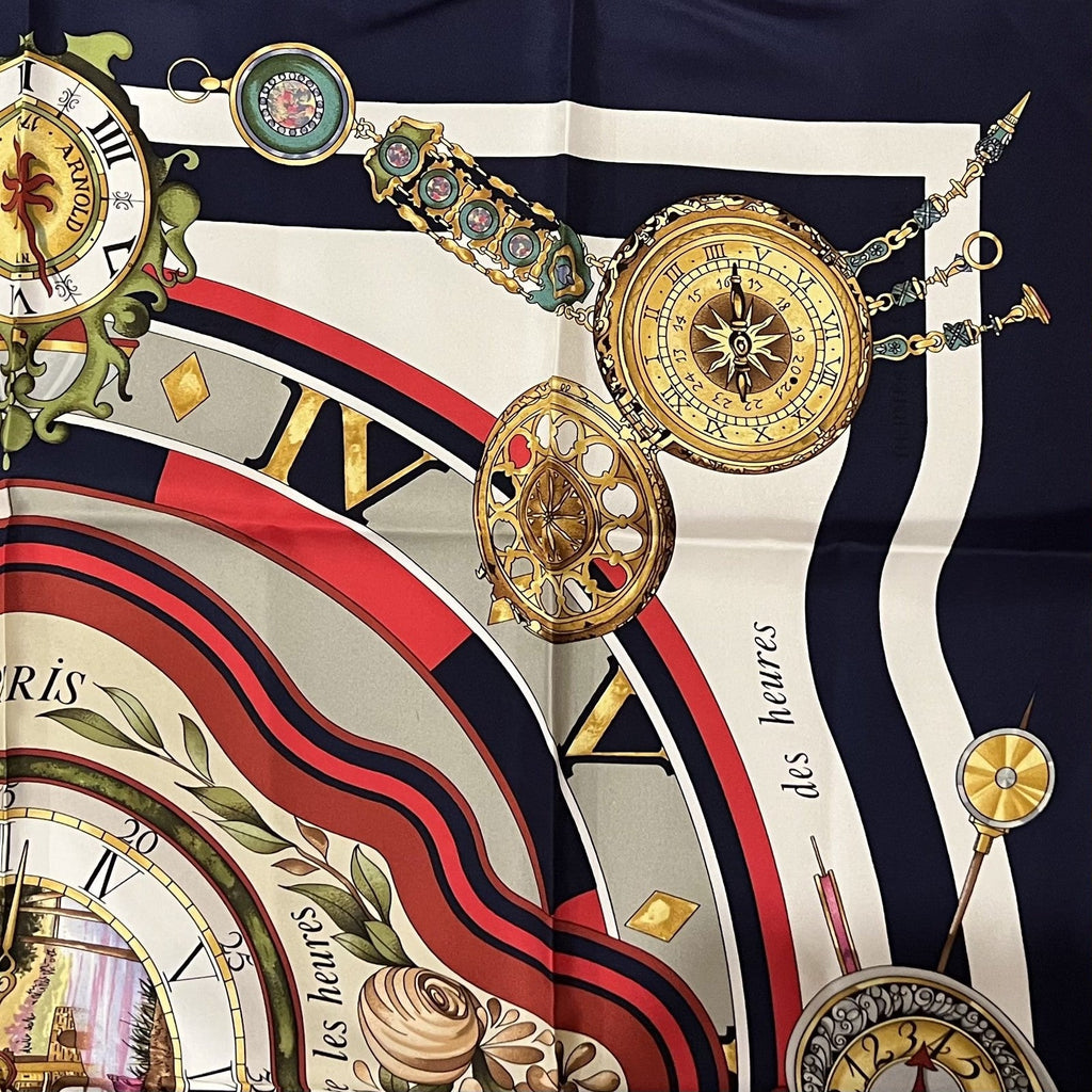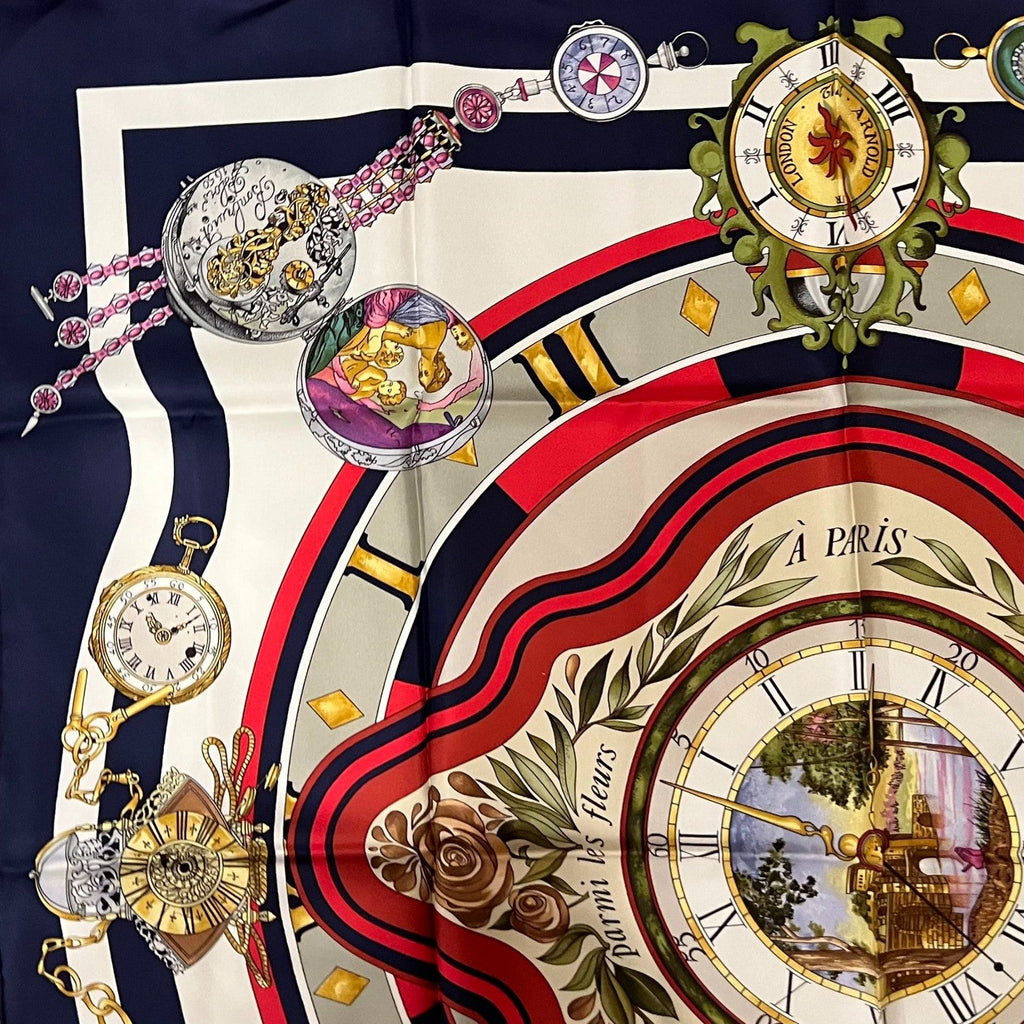 This Authentic Hermès Carré 90 silk scarf, “Parmi les Fleurs Je Compte les Heures”, in a beautiful blue palette.