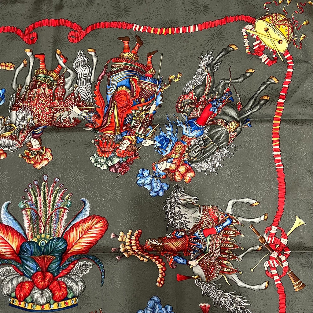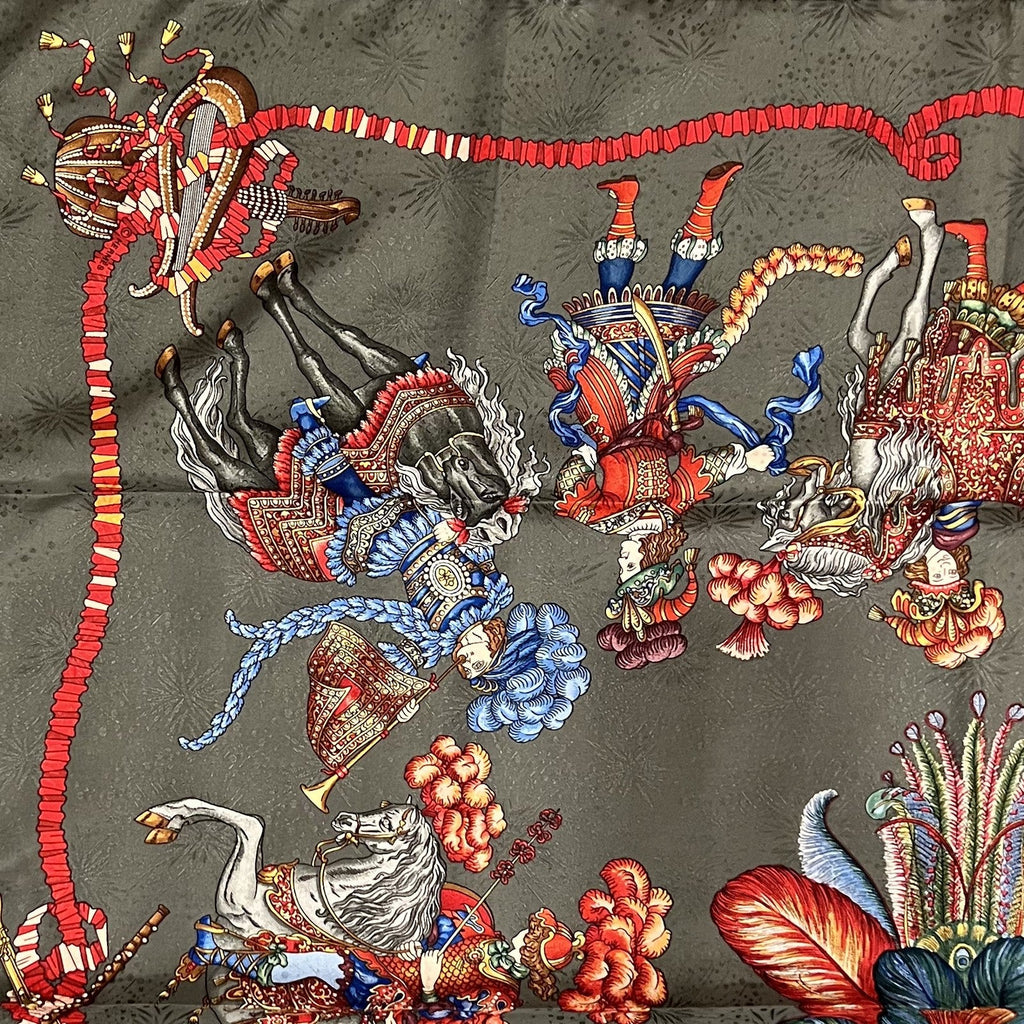 An authentic Hermès “Les Fêtes du Roi Soleil” silk scarf, inspired by the opulence and pageantry of the Sun King’s court. Crafted in luxurious Hermès silk twill, the richly detailed design evokes regal elegance and historical grandeur. A timeless collectible piece for discerning fine fashion clientele.