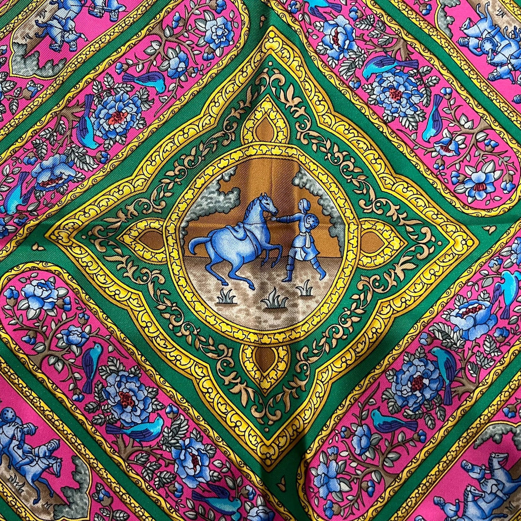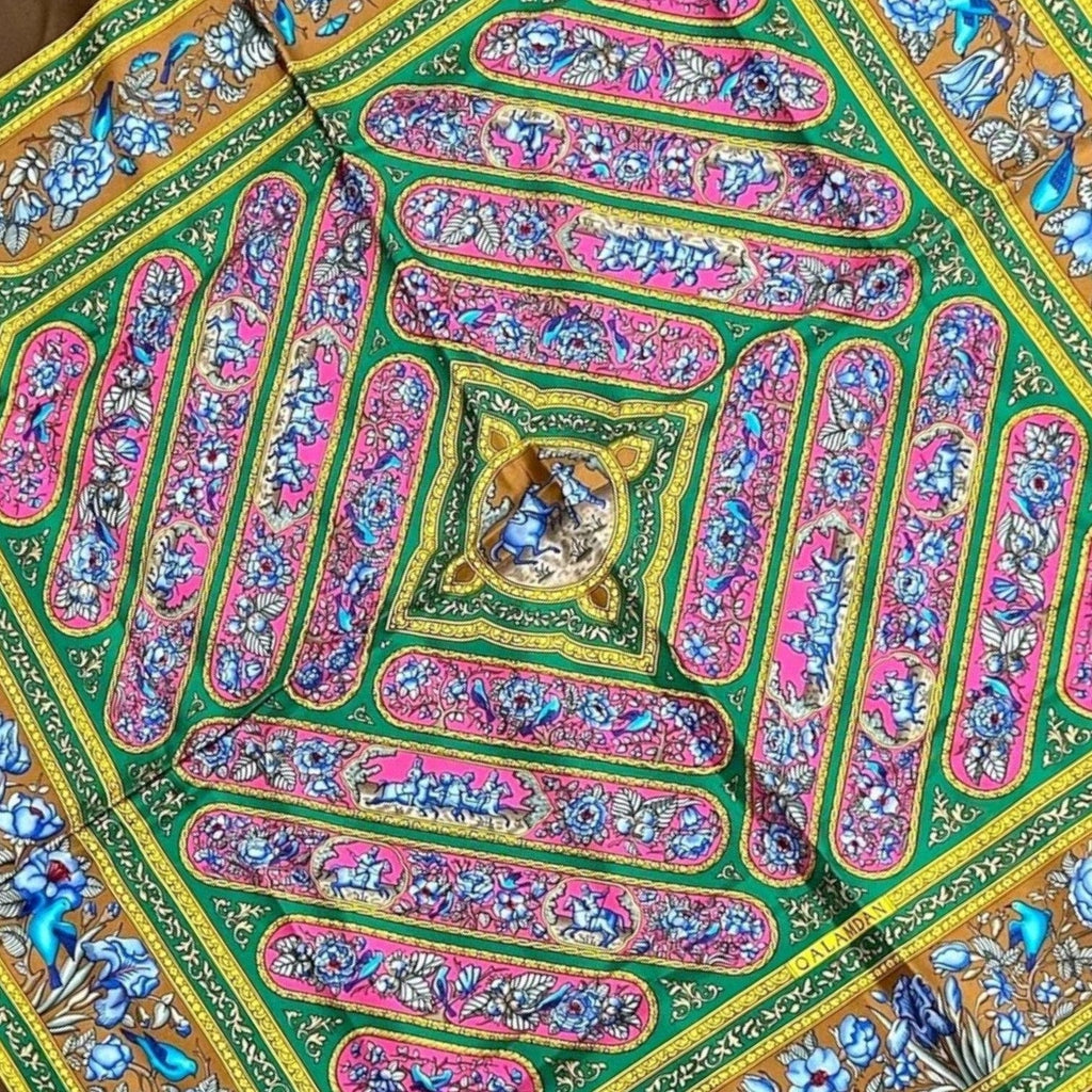 The pattern draws on the artistry of ornate Persian pen boxes (qalamdans)—a cultural symbol of craftsmanship and elegance—transformed into a detailed, decorative silk carré.