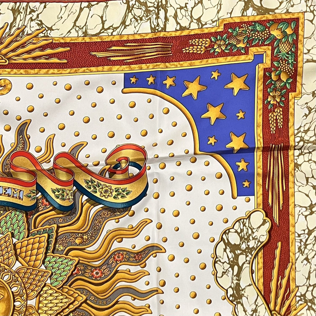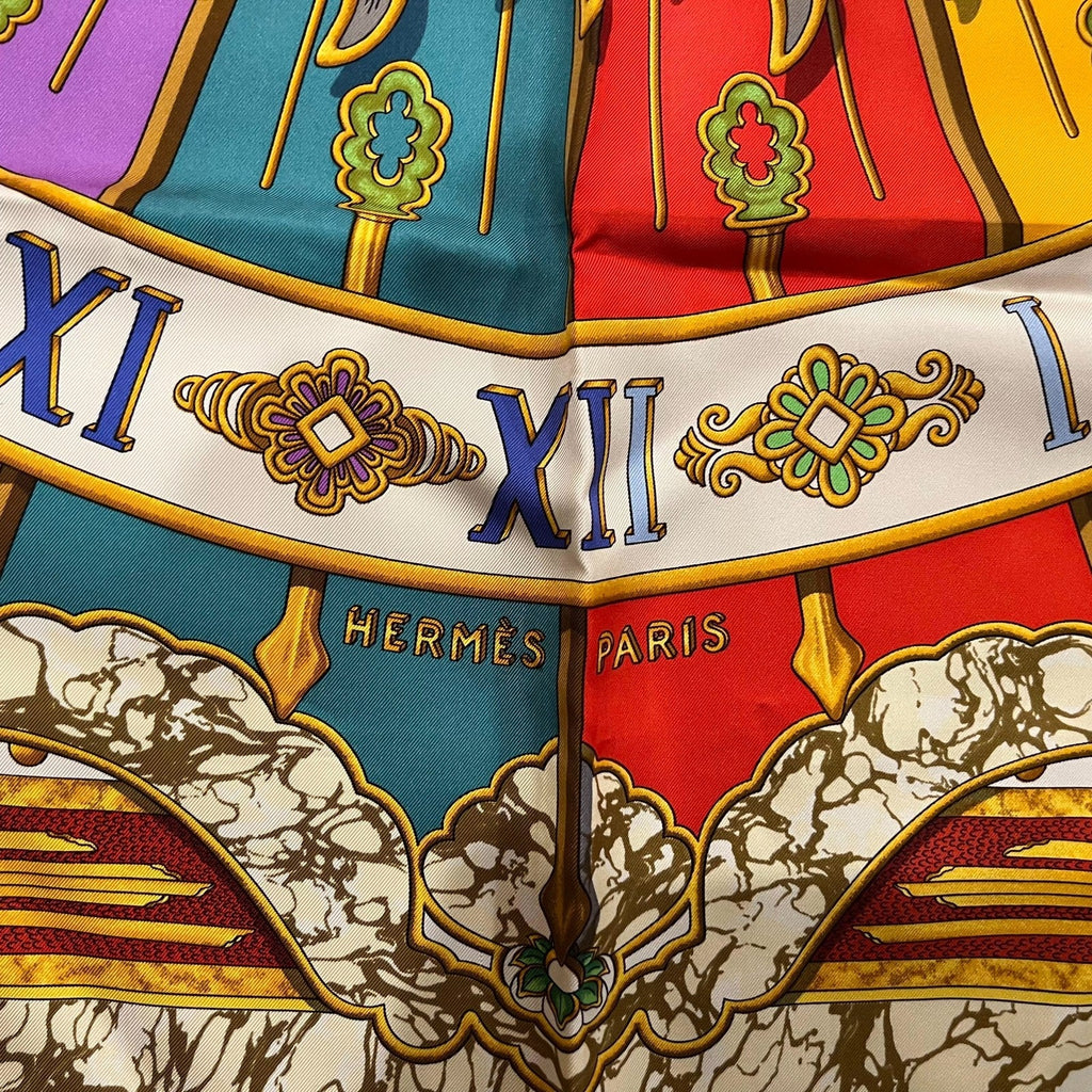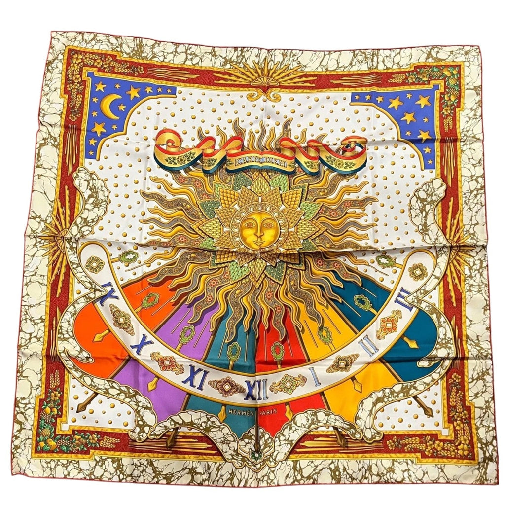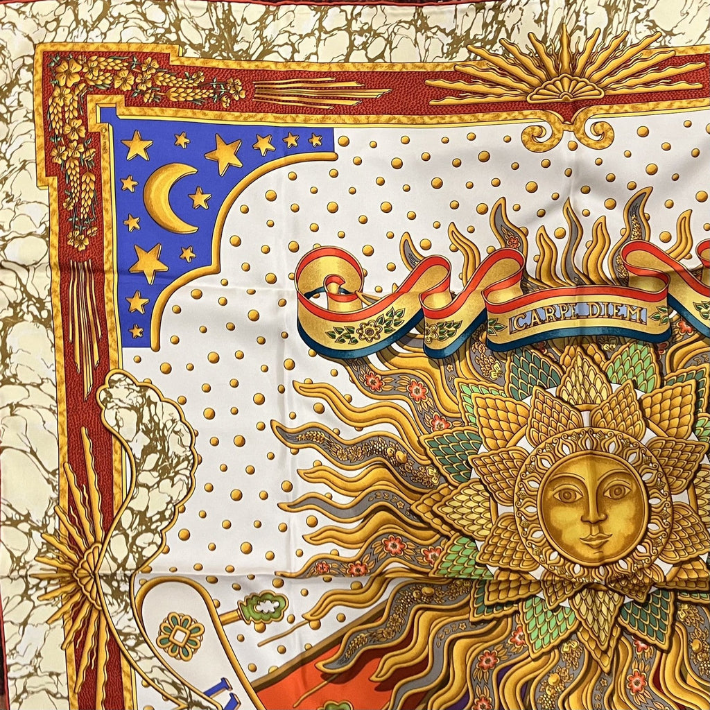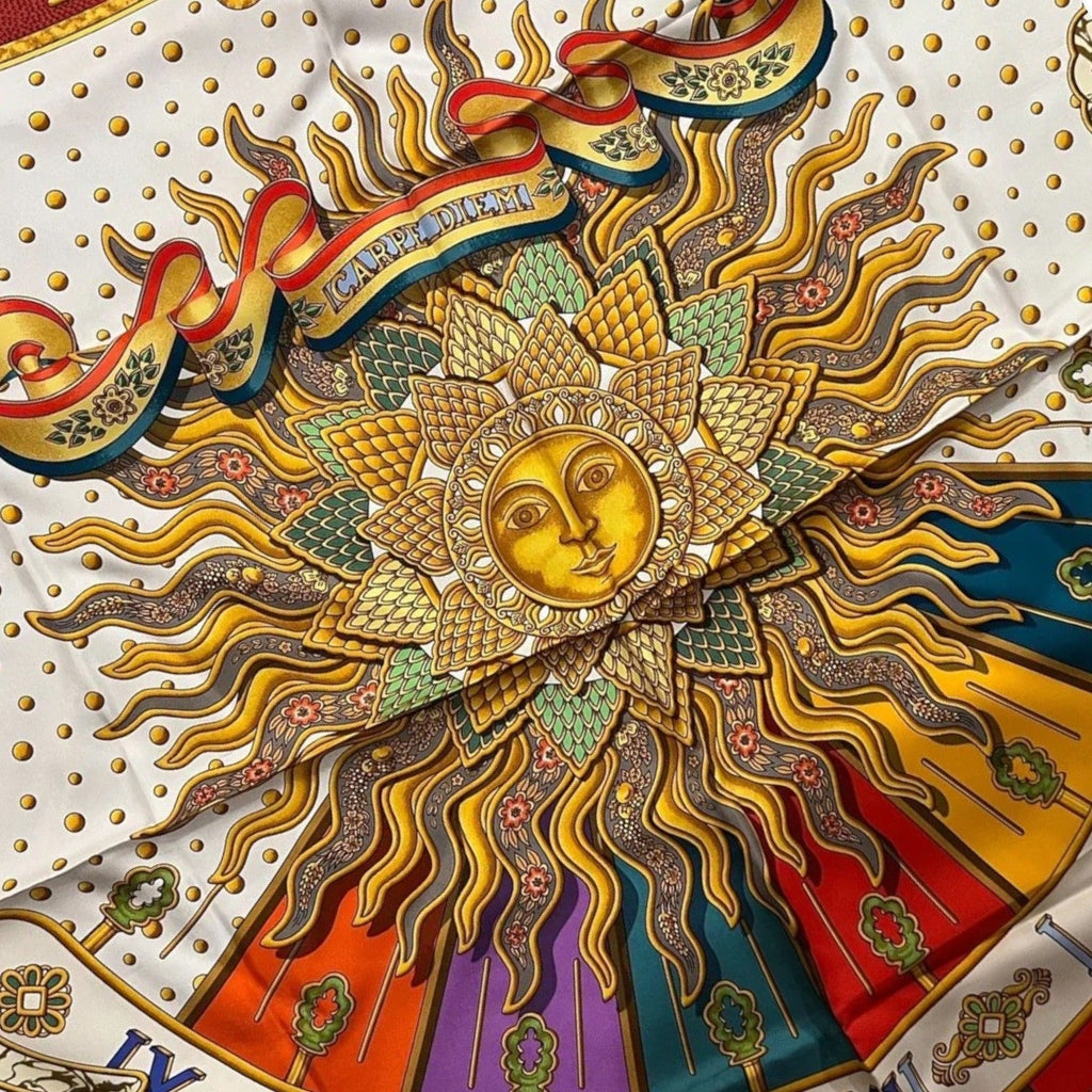 This Authentic Hermès Silk Carpe Diem 90 cm scarf, featuring a vibrant, uplifting design that celebrates the spirit of seizing the day.