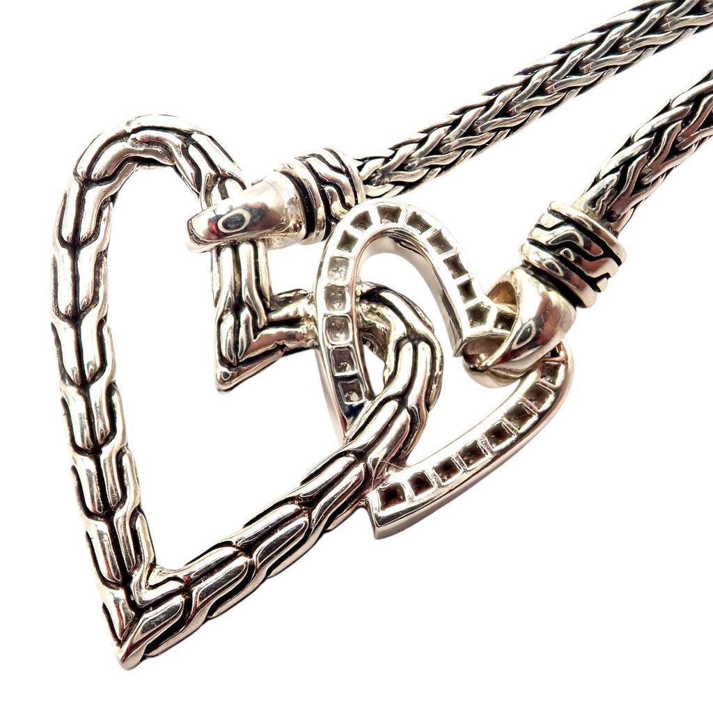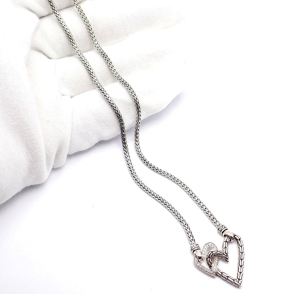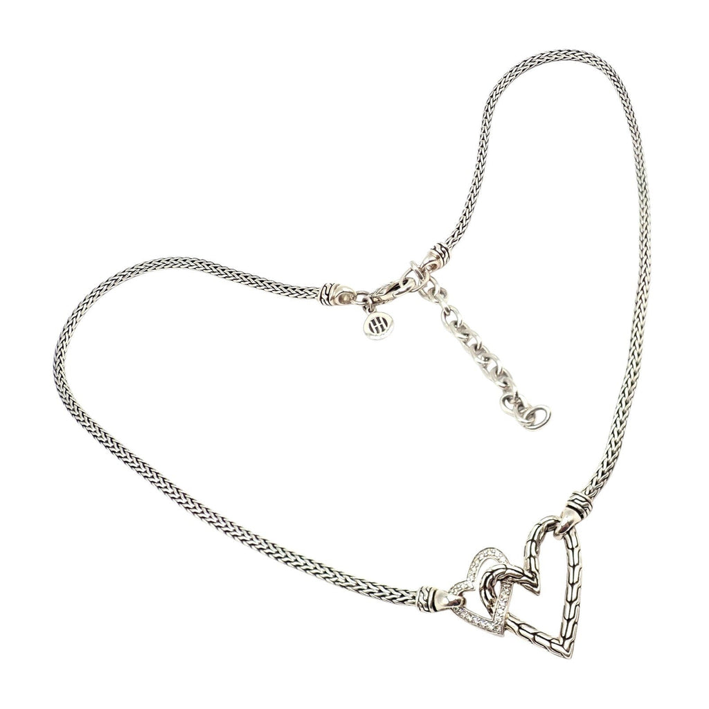 The Authentic John Hardy JH Silver Diamond Double Heart Manah Necklace is a beautifully crafted piece featuring two interlocking heart-shaped pendants, symbolizing unity and love.