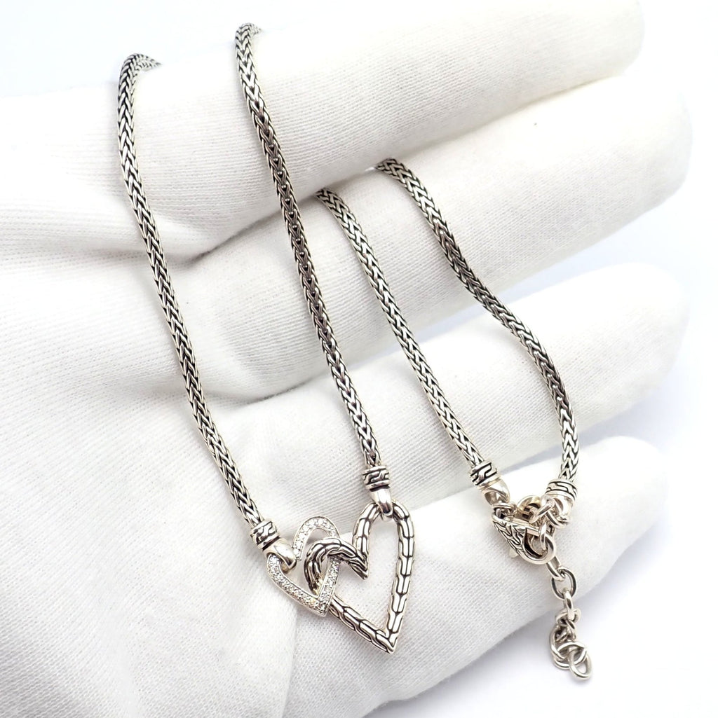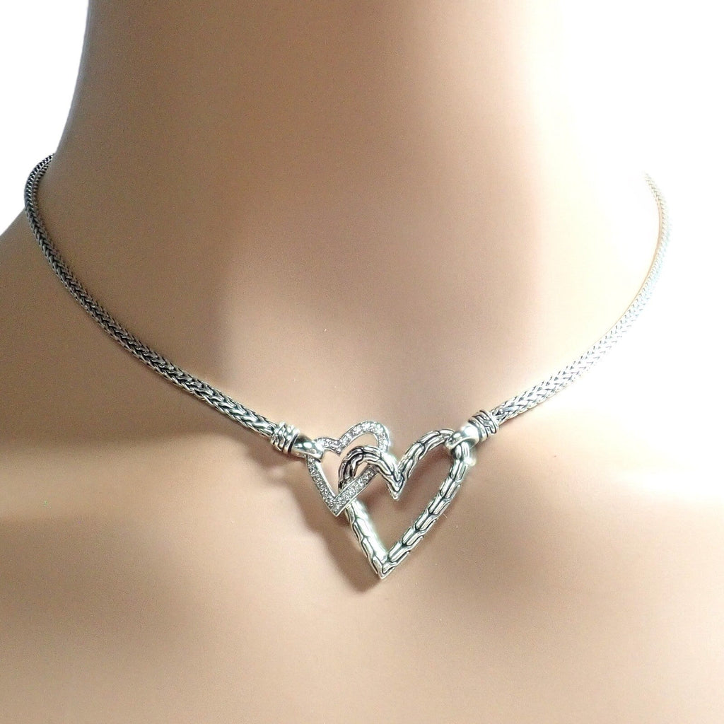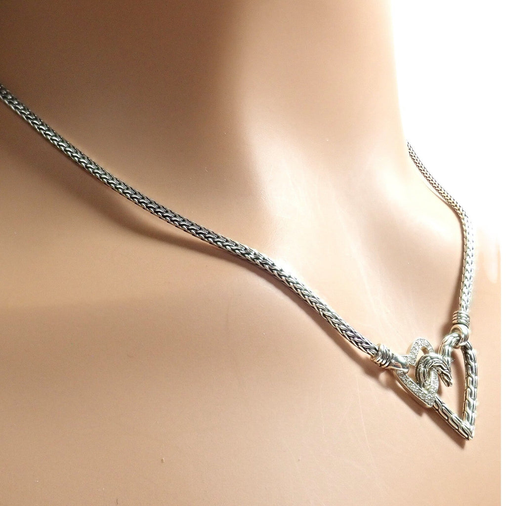 The Authentic John Hardy JH Silver Diamond Double Heart Manah Necklace is a beautifully crafted piece featuring two interlocking heart-shaped pendants, symbolizing unity and love.