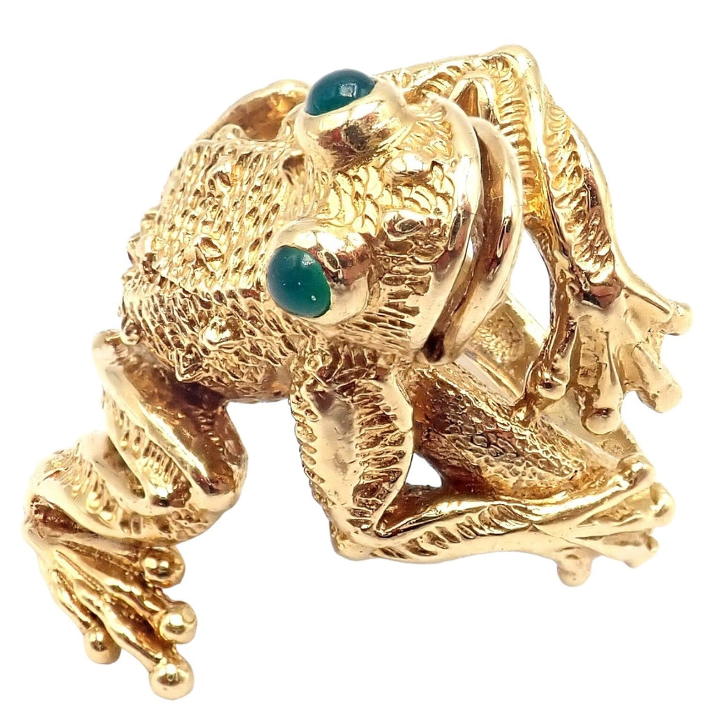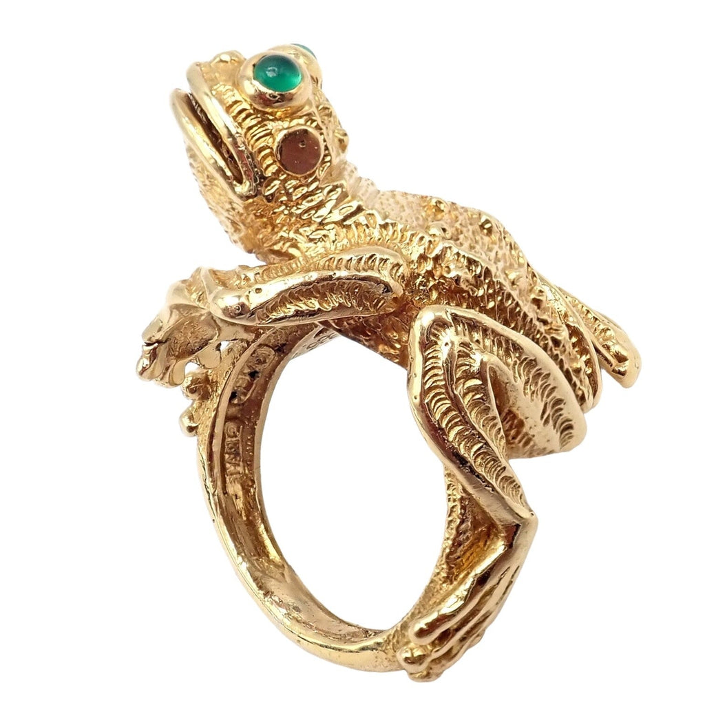 The Kurt Wayne Frog Ring is a whimsical masterpiece crafted from 18k yellow gold, featuring a frog motif with sparkling emerald eyes.