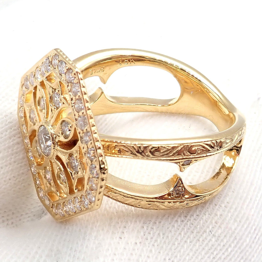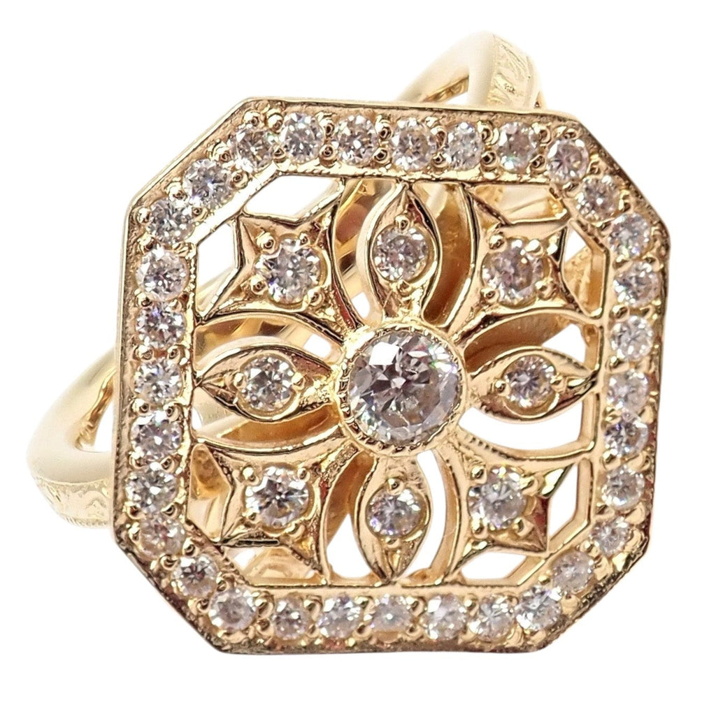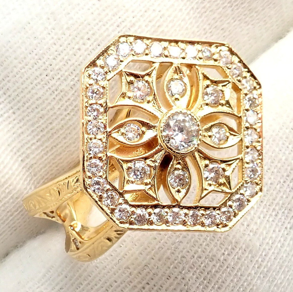 This Loree Rodkin 18k yellow gold ring features an ornate diamond-studded cross motif framed within an octagonal halo.