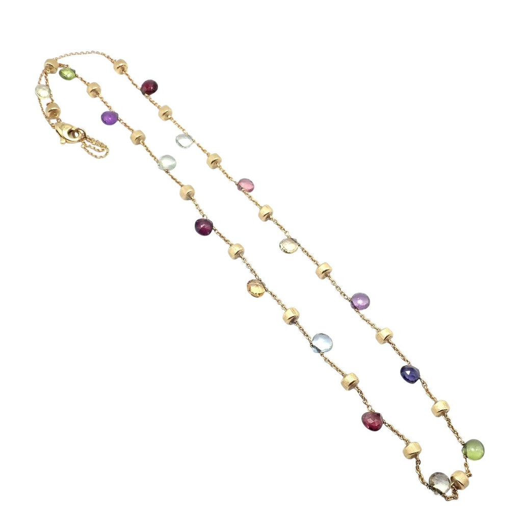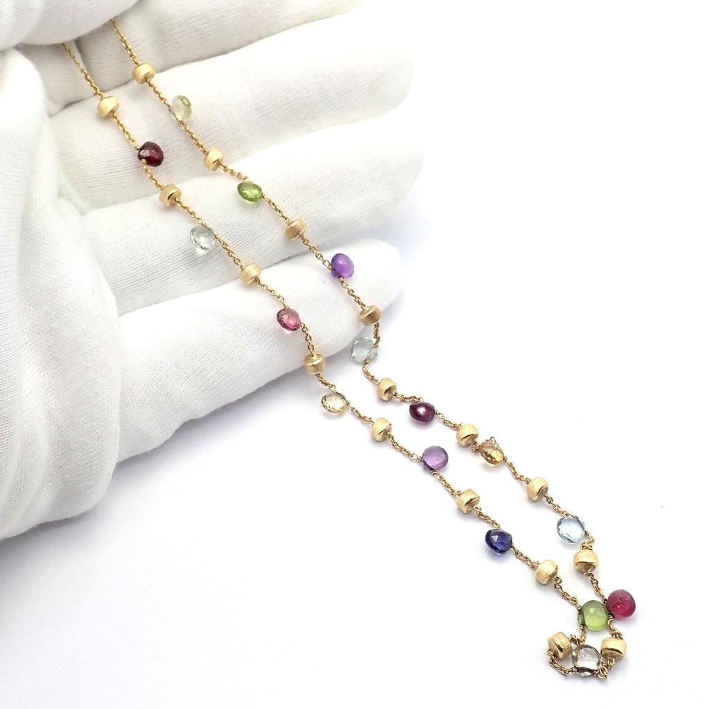 The Marco Bicego 18k Yellow Gold Paradise Necklace showcases an array of vibrant, multicolored gemstones, elegantly set along a delicate gold chain.