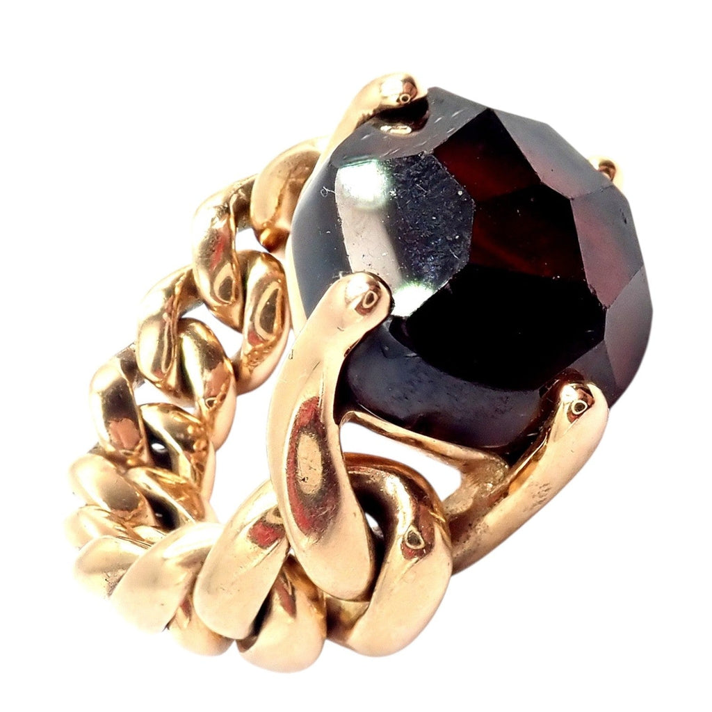 The Pomellato Lola Madeira ring in 18k yellow gold highlights a richly faceted deep red garnet held by sculptural prongs.