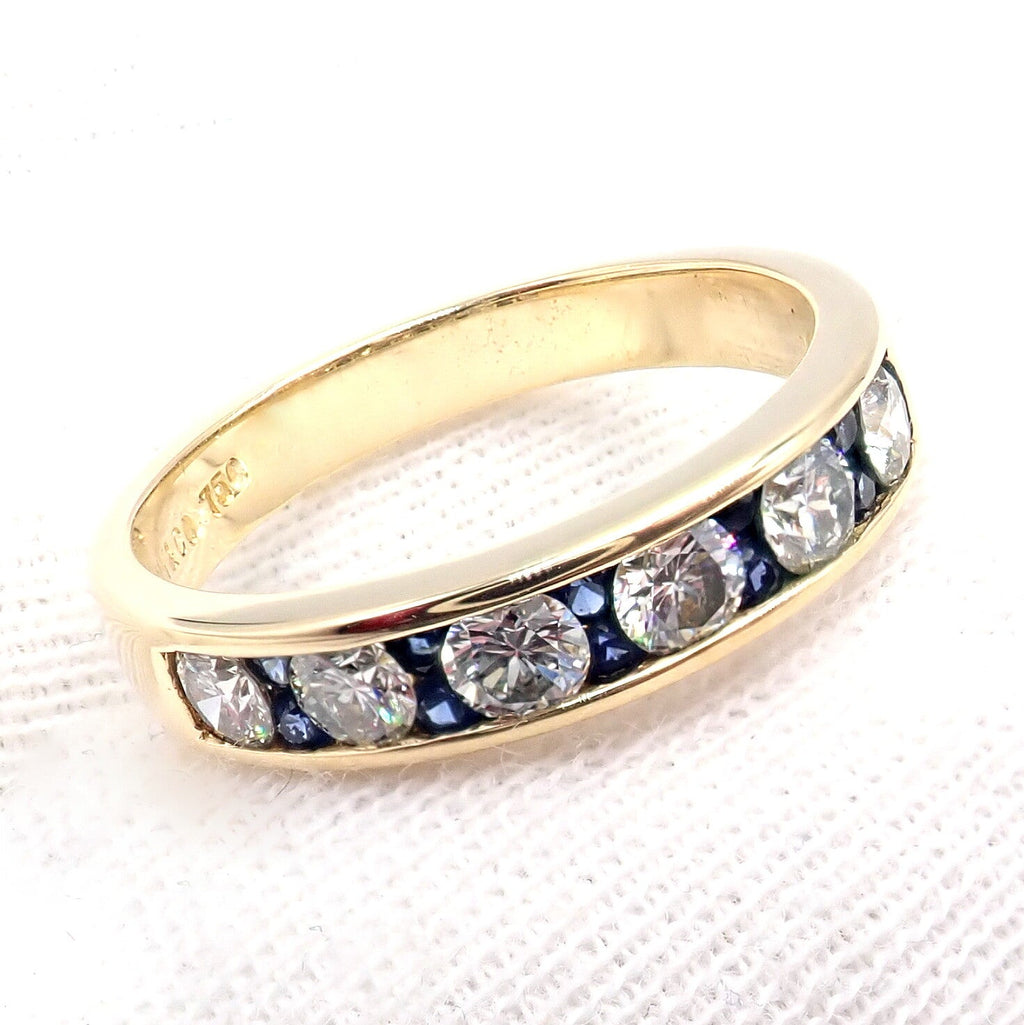 Authentic Tiffany & Co. 18k yellow gold band ring featuring 1.20 carats total weight of dazzling round diamonds and rich blue sapphires in a sleek channel setting.