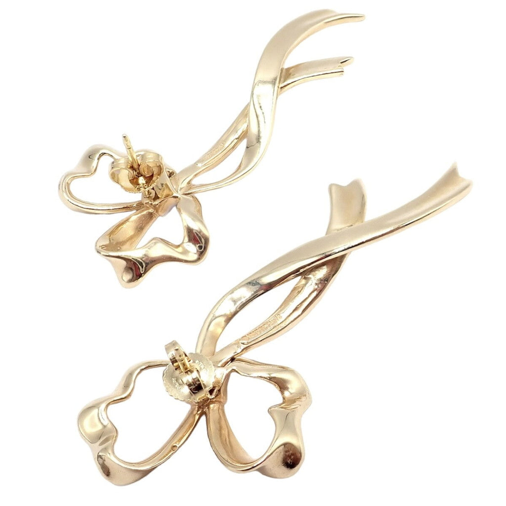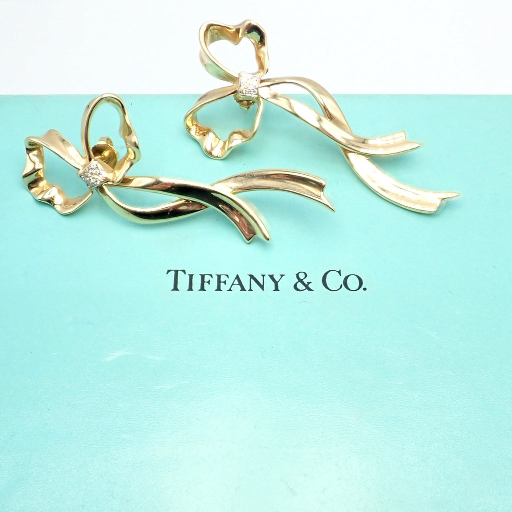 The Authentic Tiffany & Co 18k Yellow Gold Diamond Large Ribbon Bow Earrings from 1985 are a stunning and luxurious piece of jewelry.