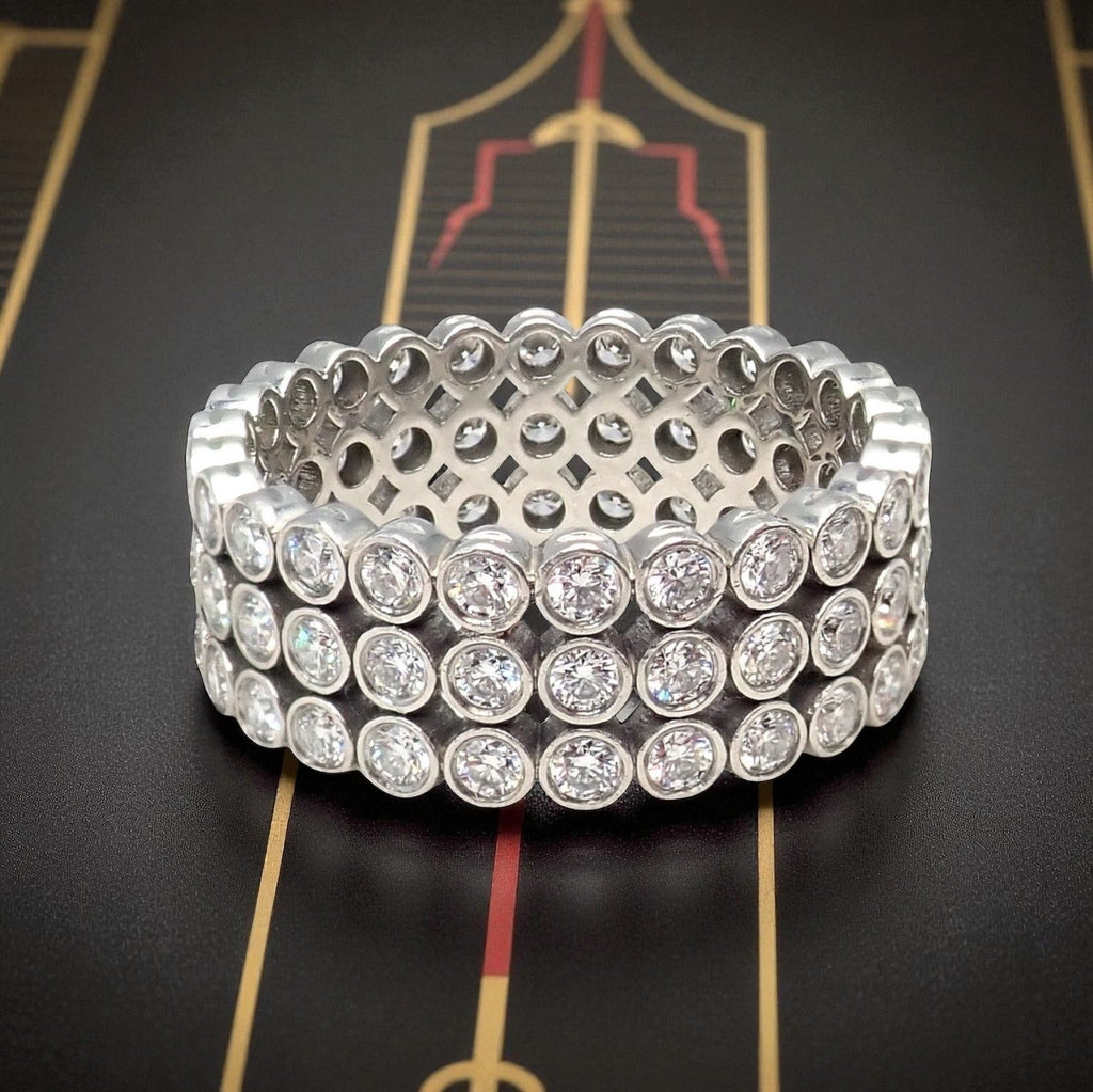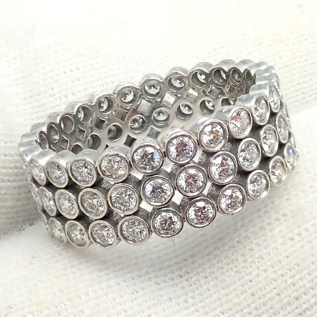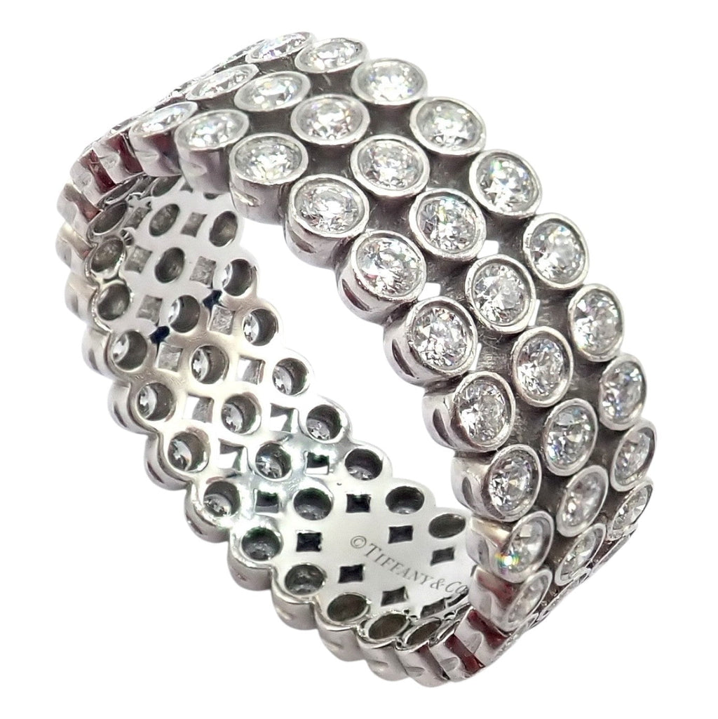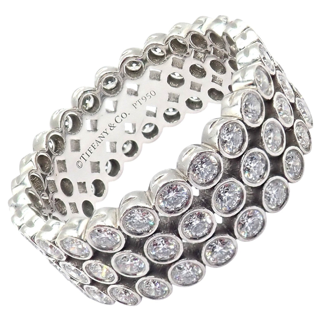 This authentic Tiffany & Co. Jazz band ring features three rows of brilliant bezel-set diamonds in luxurious platinum.
