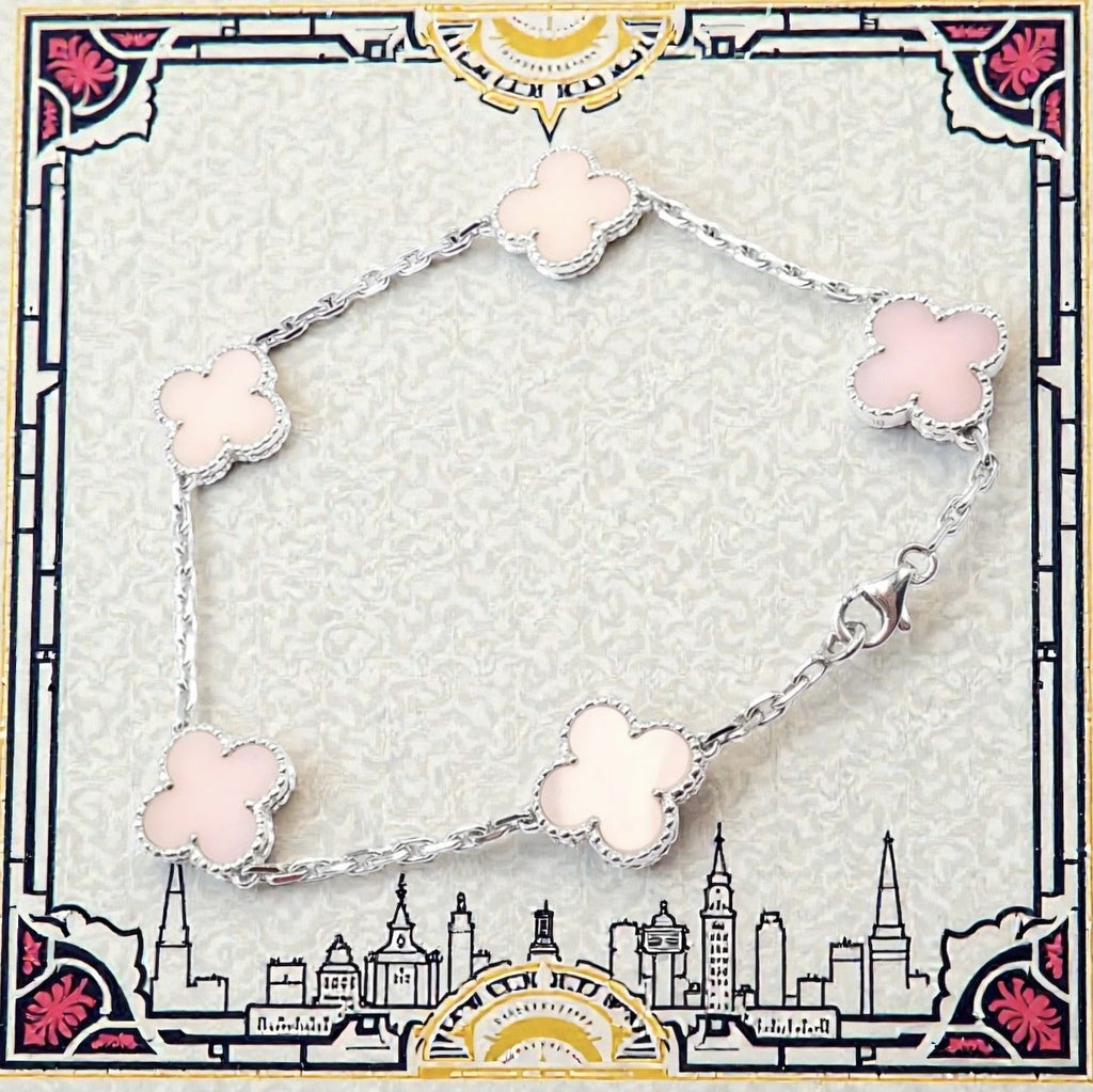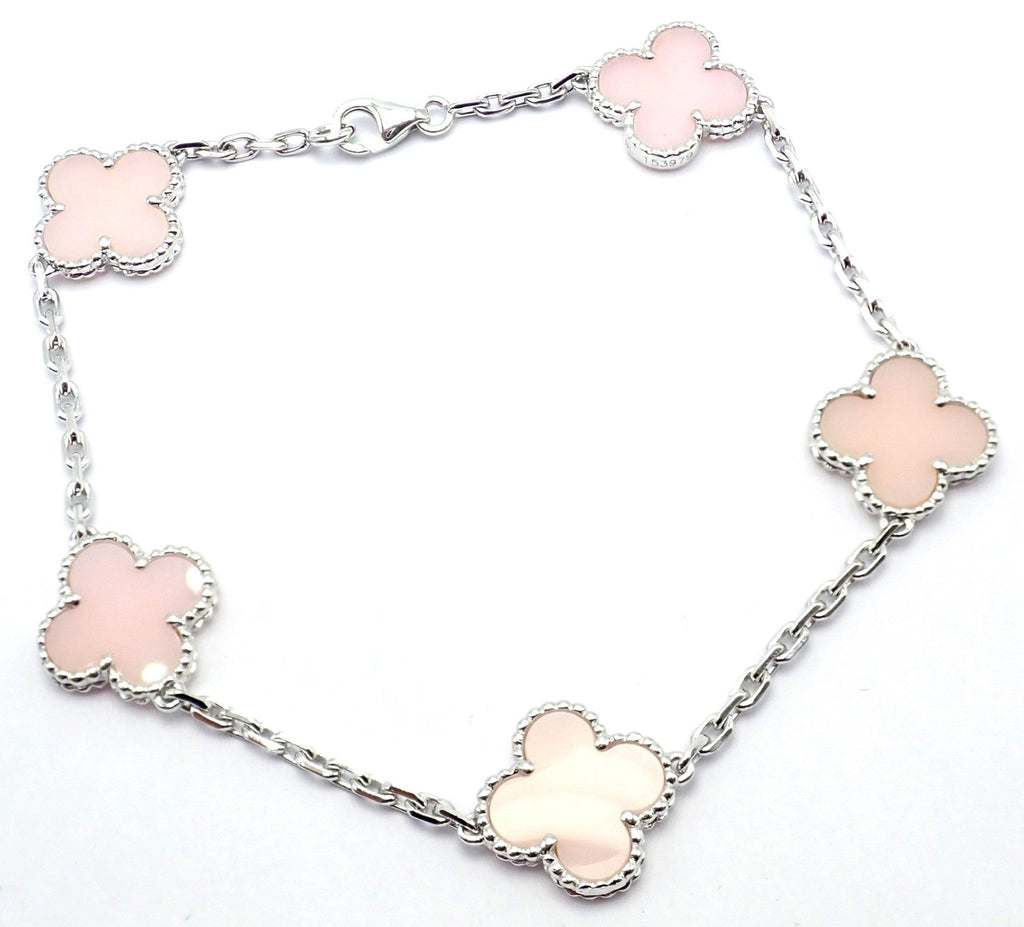 Van Cleef & Arpels Alhambra bracelet in 18k white gold featuring five soft pink opal motifs framed by delicate beaded edges.