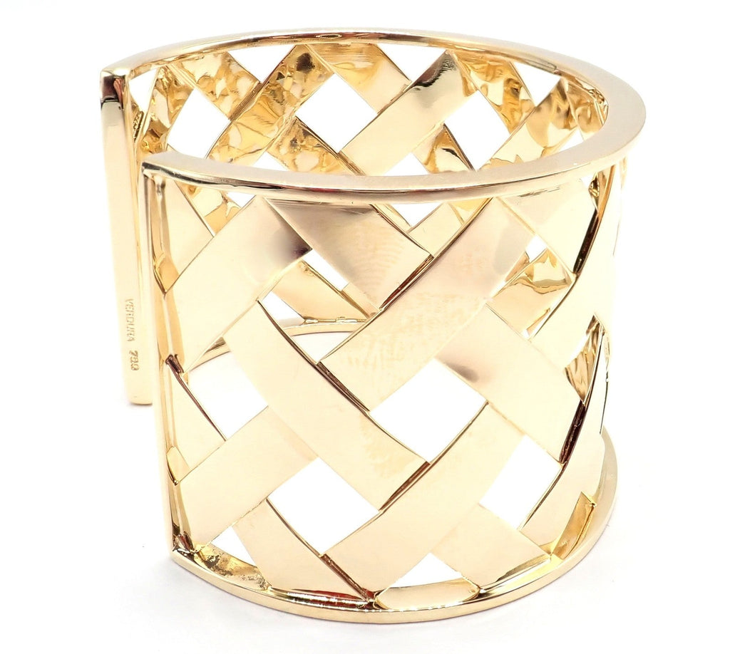 Handcrafted in 18k yellow gold, this Verdura Criss Cross Wide Cuff Bracelet exemplifies iconic style.