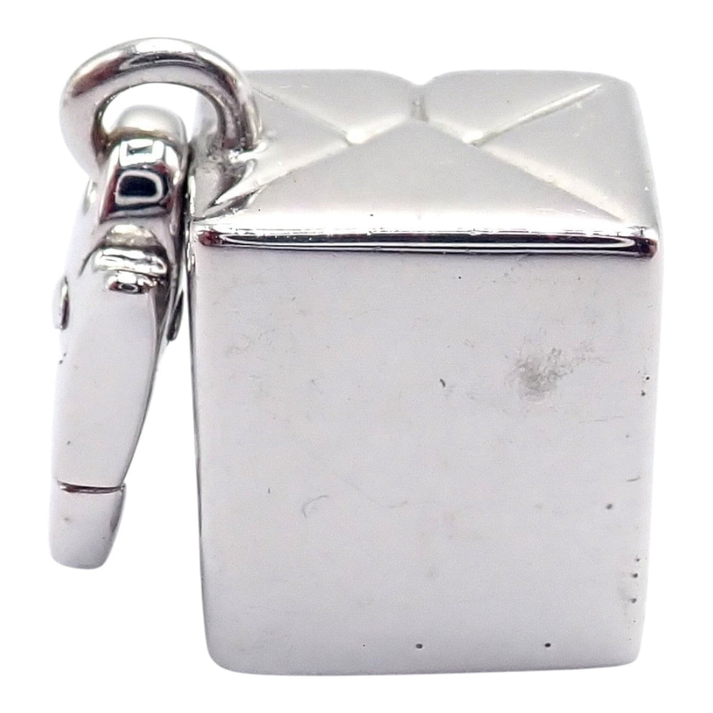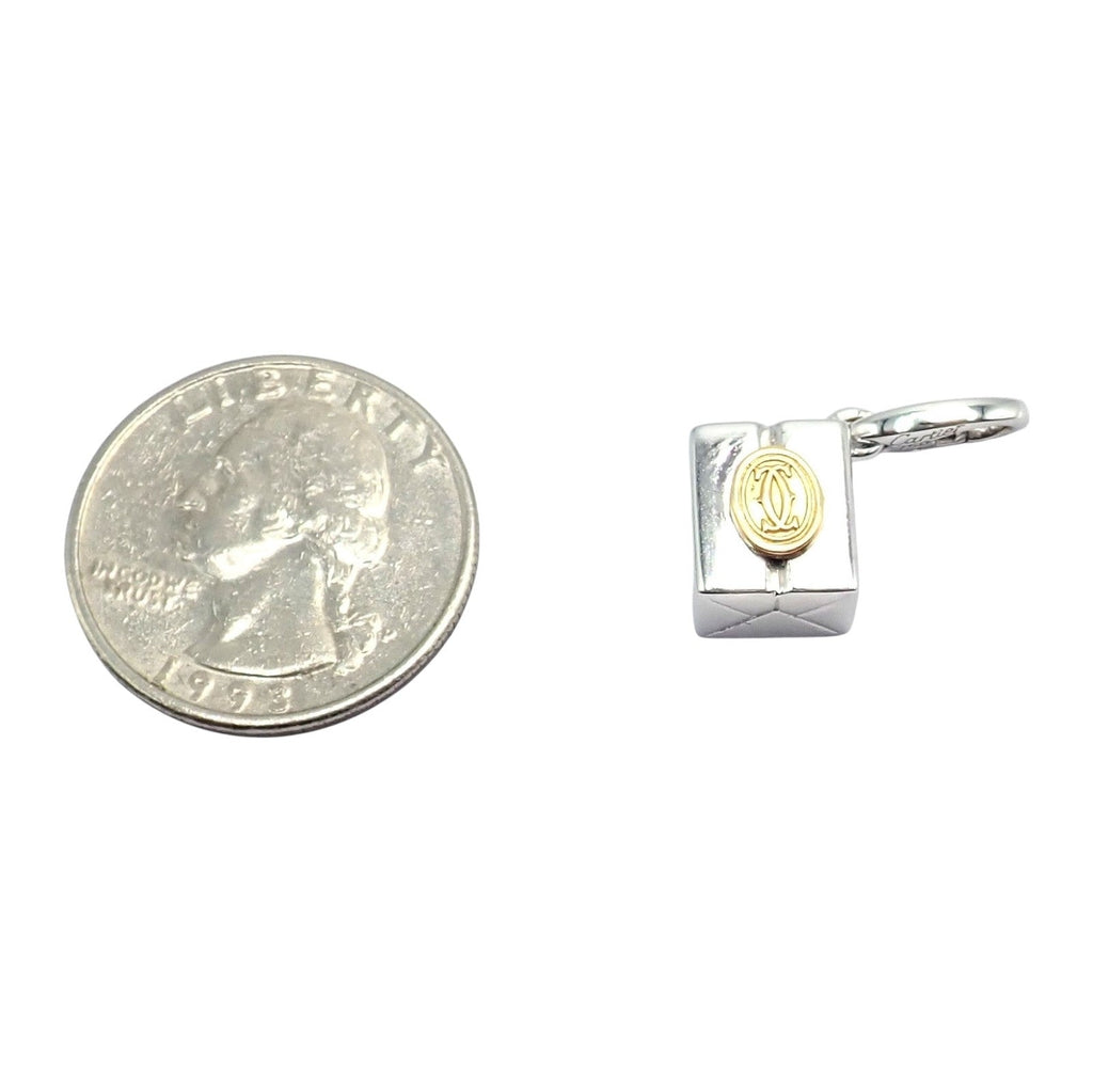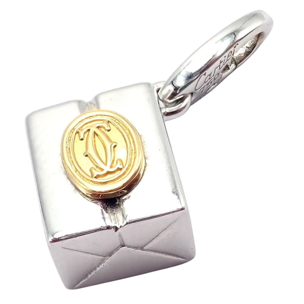 Vintage Cartier charm pendant crafted as a polished white gold gift box adorned with an 18k yellow gold Cartier Double C logo.