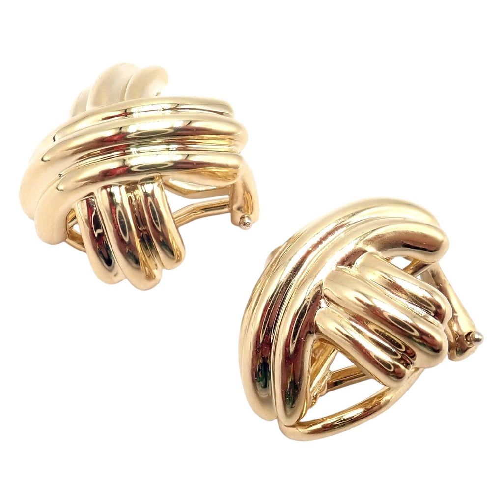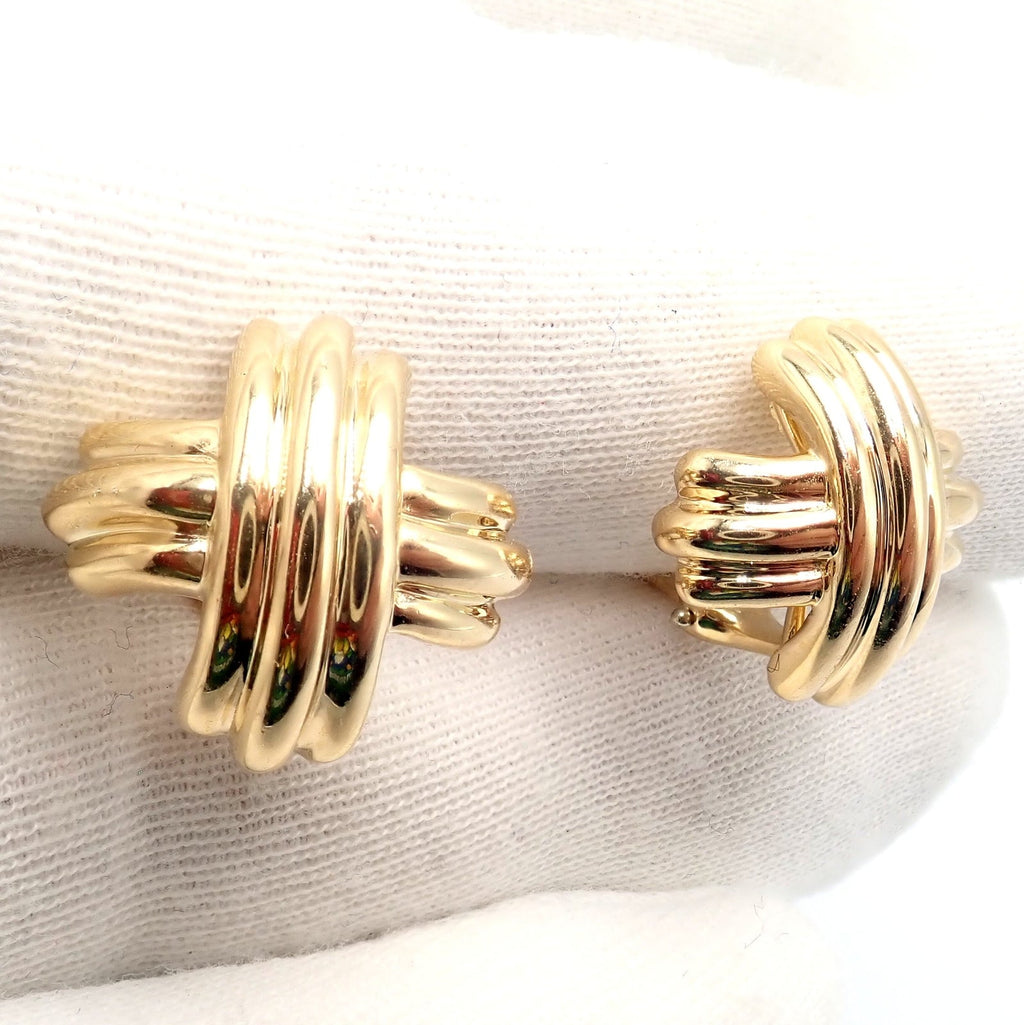 These vintage Tiffany & Co. X Kiss earrings are elegantly crafted in 18k yellow gold, embodying timeless sophistication.