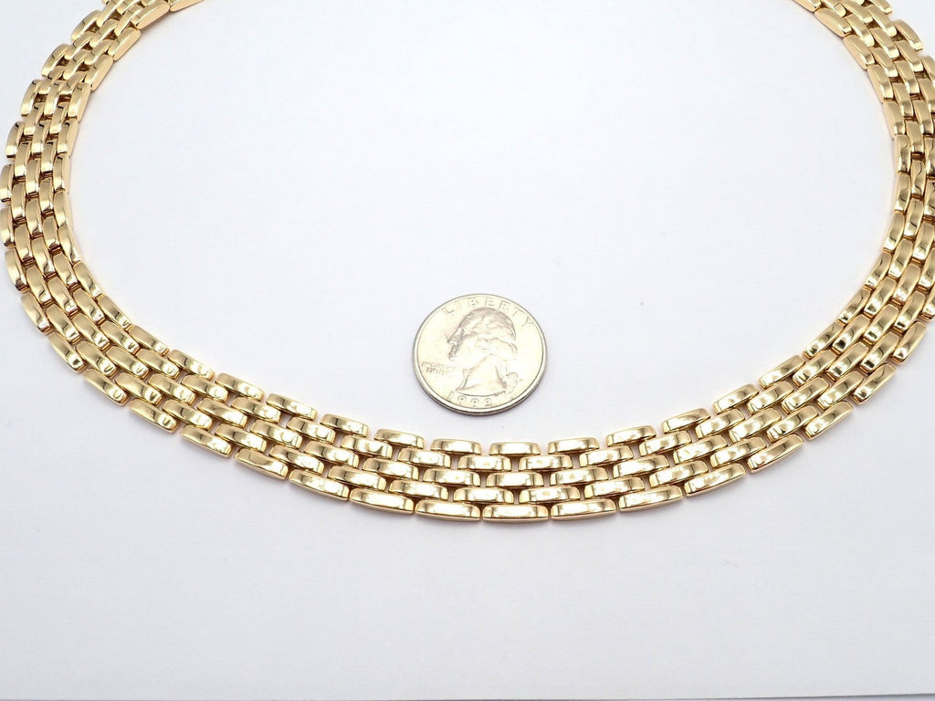 This Cartier Maillon Panthère Necklace features five luxurious rows of 18k yellow gold links, each crafted for fluidity and bold elegance.