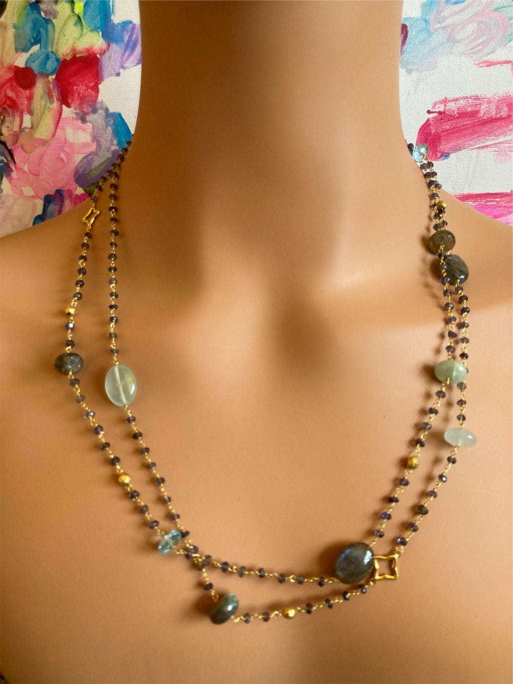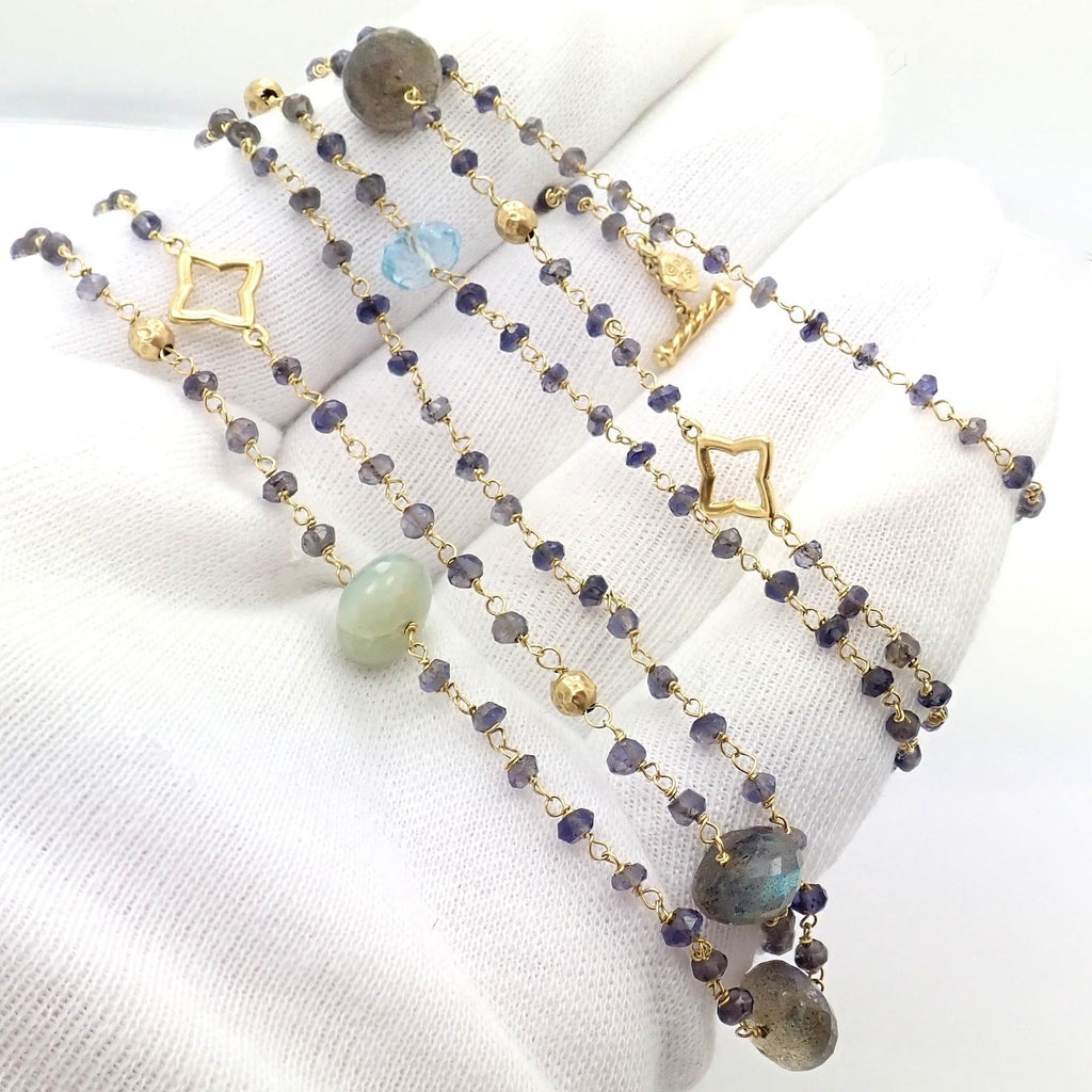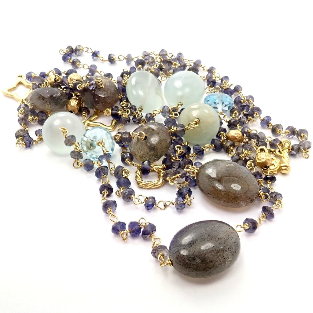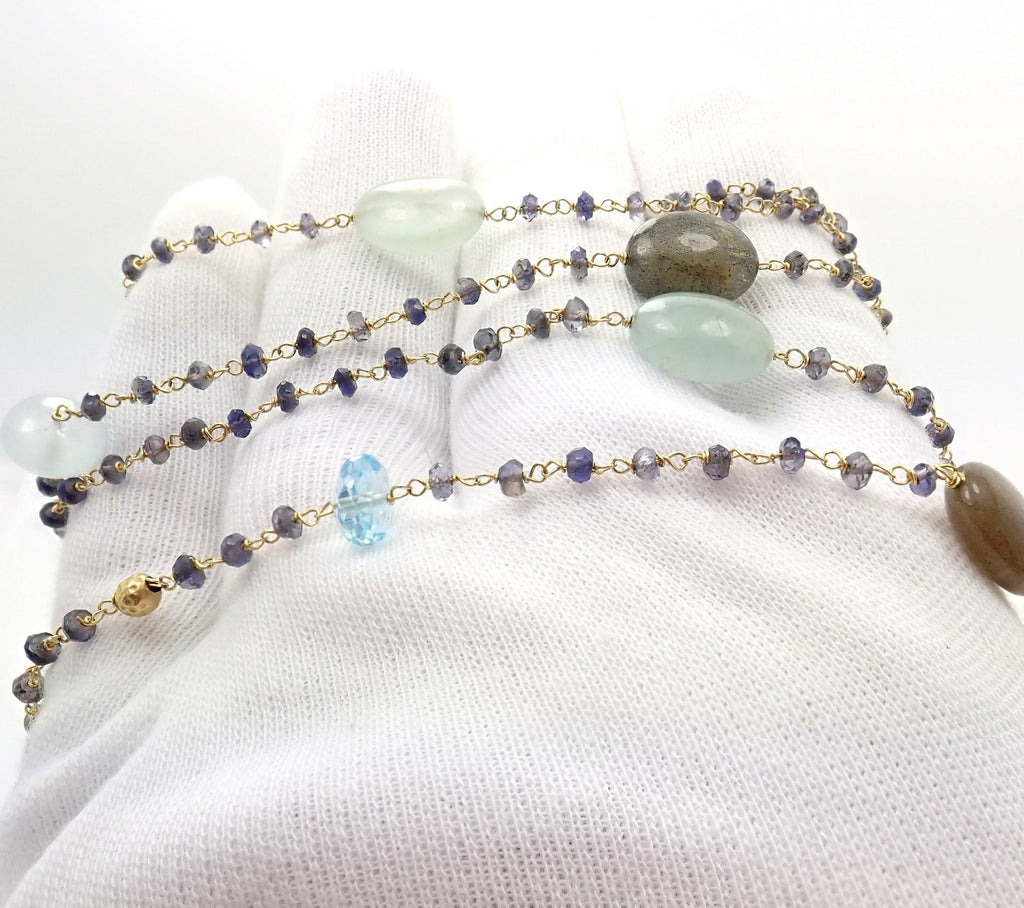 Many Small Briolette Cut Iolite Beads: 3mm 2x Briolette Cut Blue Topaz: 8mm 5x Various Cut Labradorite Stones 4x Cabuchon Cut Green Chalcedonny Stones |