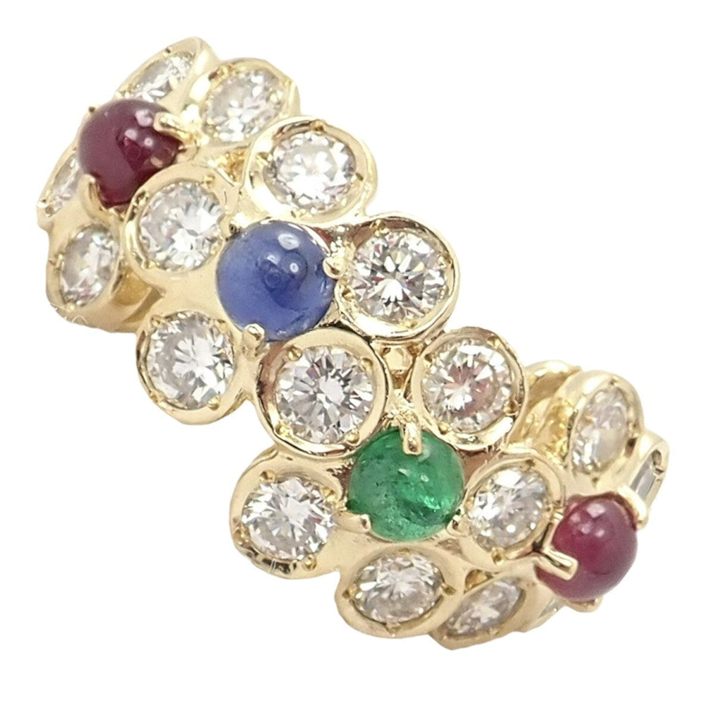 17 round brilliant cut diamonds VVS1 clarity, E color total weight approx. 1.02ctw 2x Cabushon Rubies 1x Cabushon Sapphire 1x Cabushon Emerald |