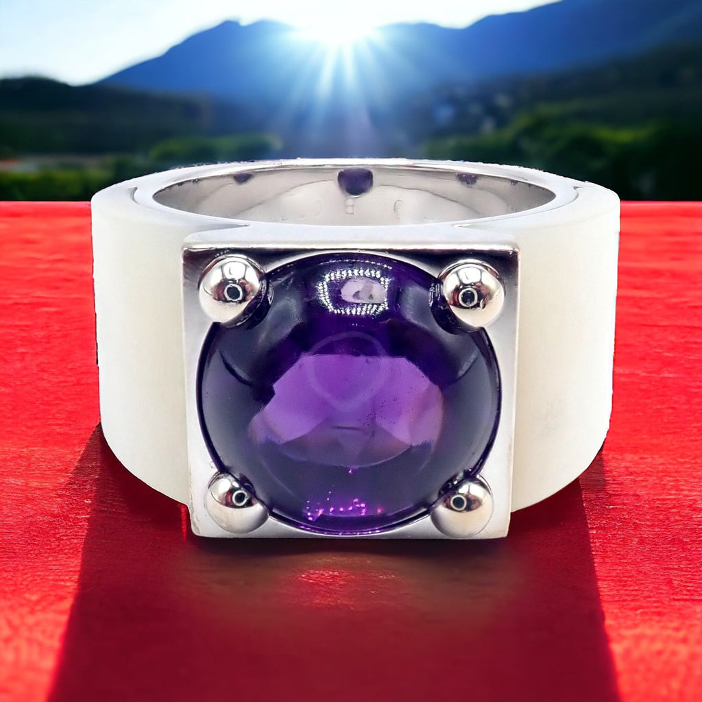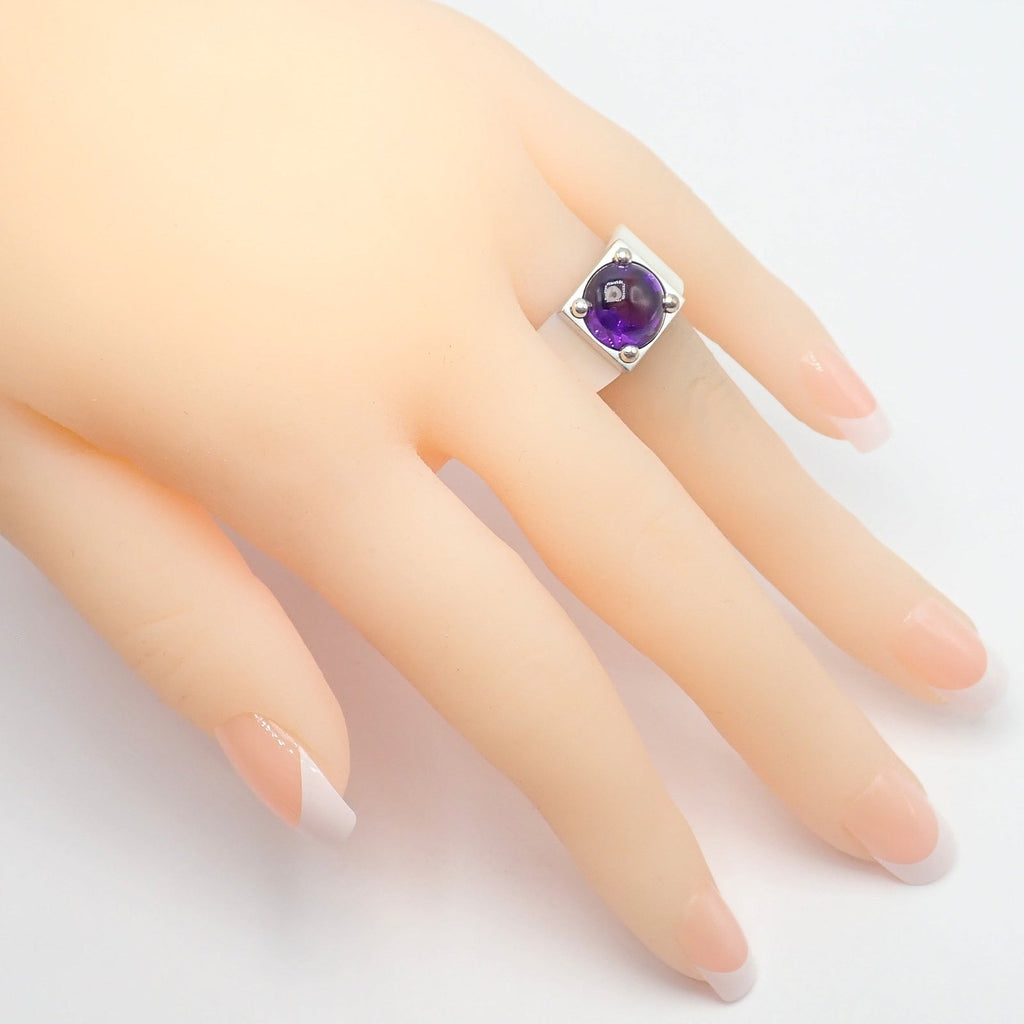 This rare, authentic Van Cleef & Arpels ring is beautifully crafted from 18k white gold, featuring a striking cabochon amethyst centerpiece.