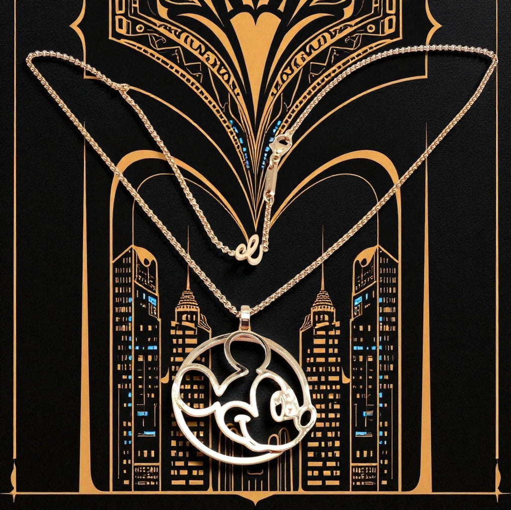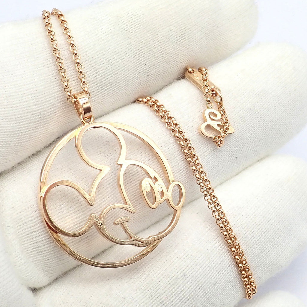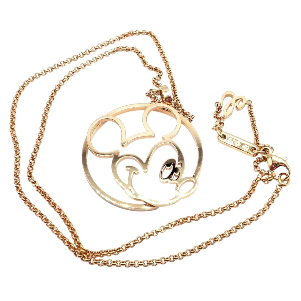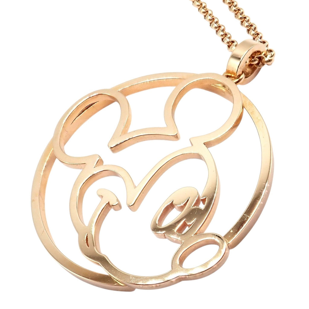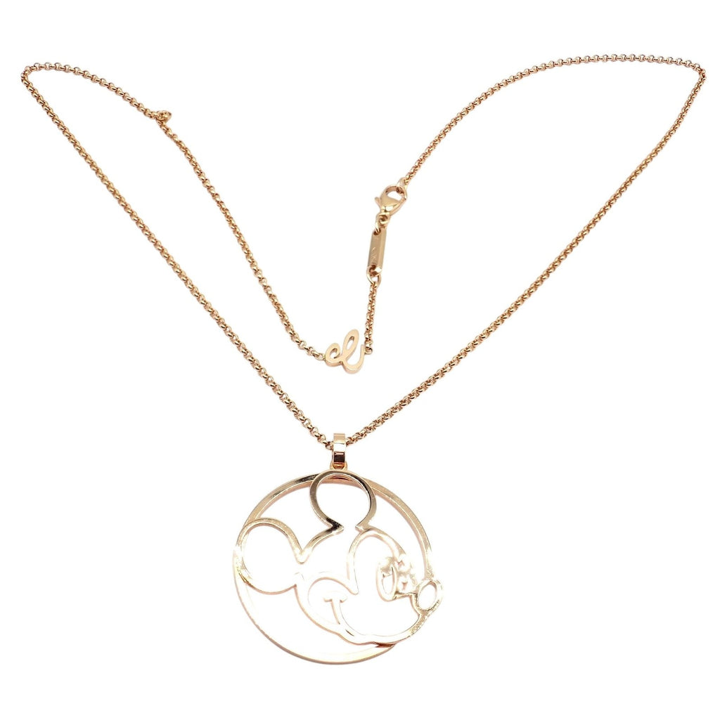 This collectible Chopard Disney World necklace features an elegant 18k rose gold pendant depicting a modern, open-work Mickey Mouse silhouette.