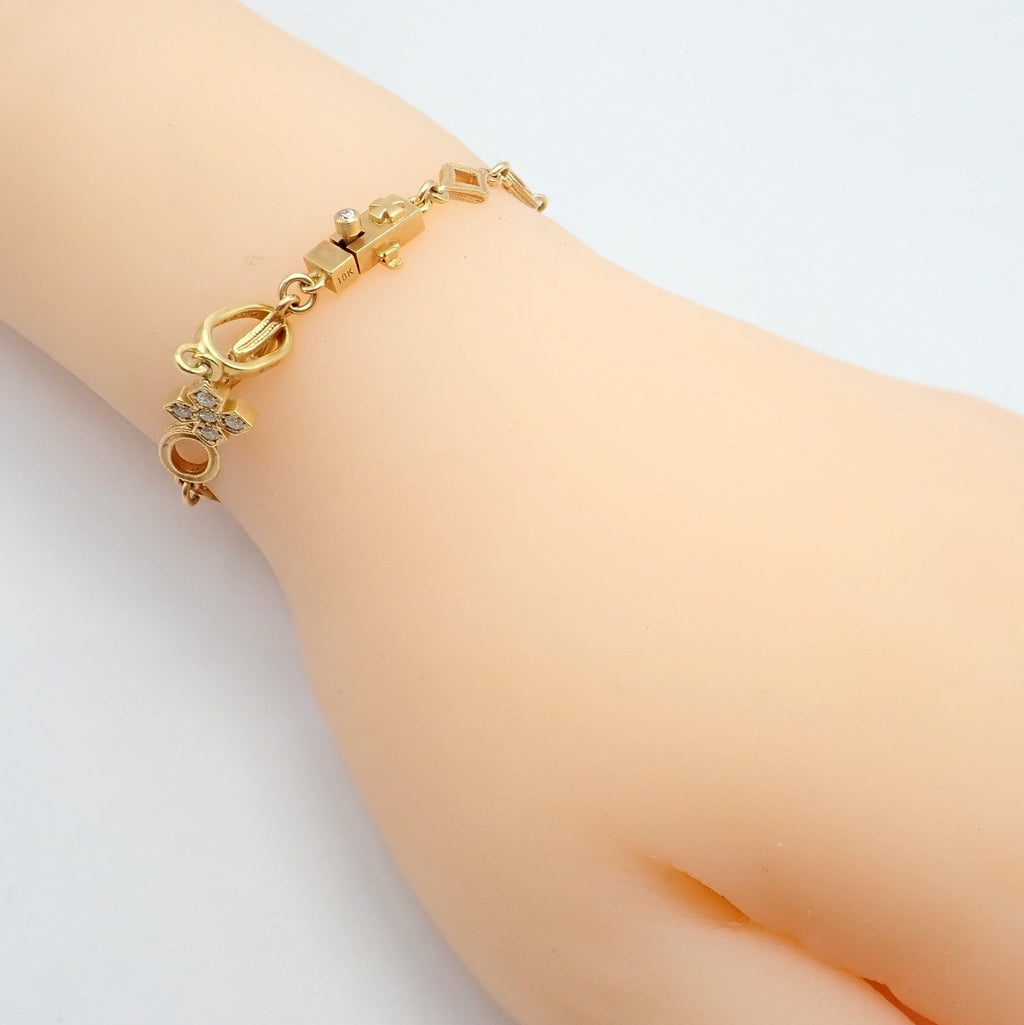 The Loree Rodkin 18k yellow gold diamond cross bracelet is a rare and exquisite piece of jewelry.