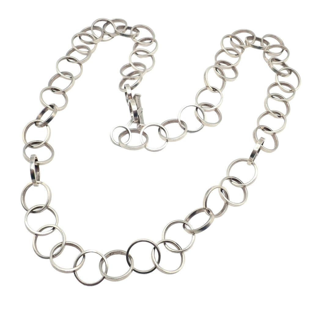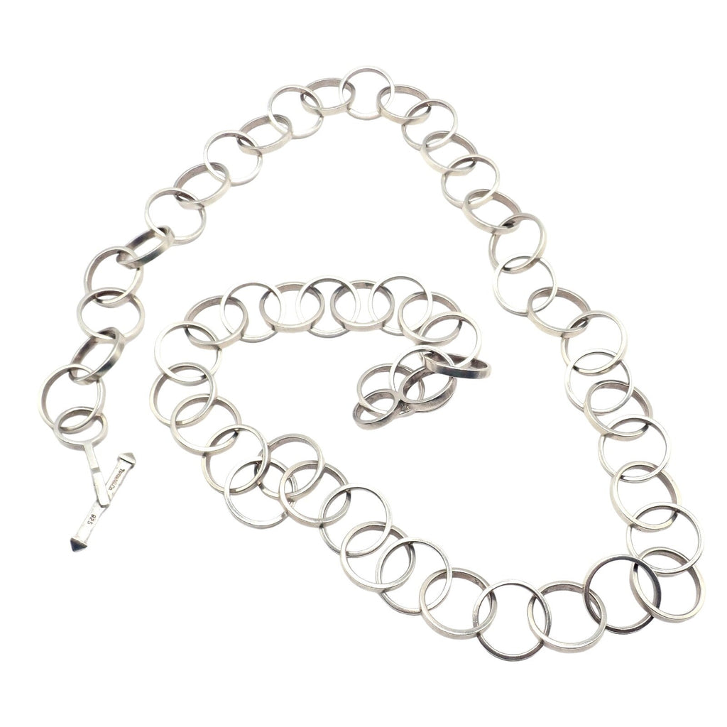 The Vintage Rare! Tiffany & Co Picasso Sterling Silver Circle Link Long 34" Necklace is an embodiment of timeless sophistication. Crafted by the legendary designer, Pablo Picasso's touch is unmistakably present in the minimalist yet impactful circle link design. Made of lustrous sterling silver, each link interconnects seamlessly, creating a harmonious 34-inch cascade. This necklace exemplifies the union of Tiffany's luxury with Picasso's avant-garde artistry, presenting a collectible piece that transcends eras with its elegance. Can be worn in multiple layers in different lengths. Ultimate versatility. Lovely arrow toggle clasp.