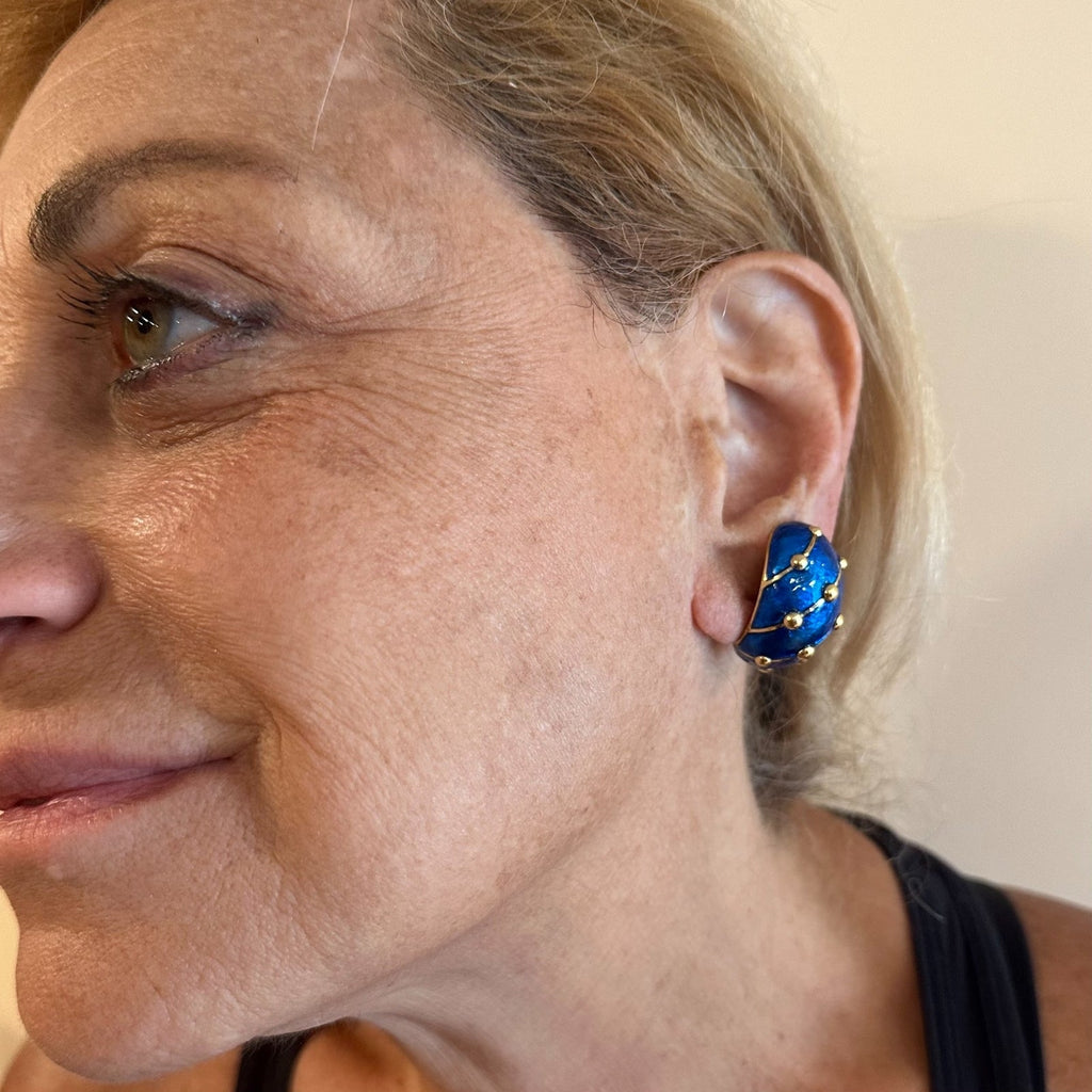 Designed by Jean Schlumberger, they feature vibrant blue enamel on 18k yellow gold.