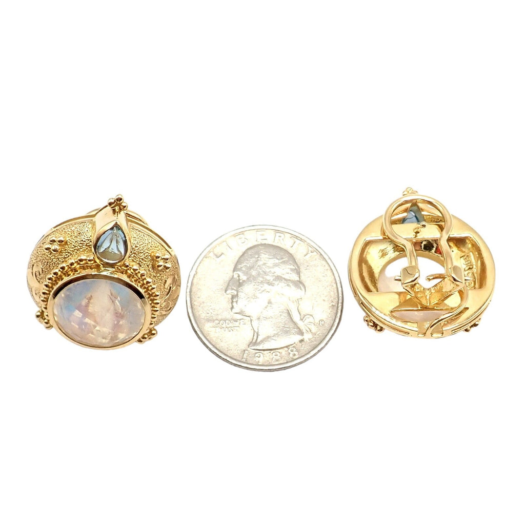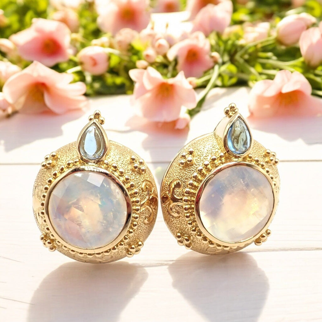 They feature stunning aquamarine and moonstone gemstones set in a round design.