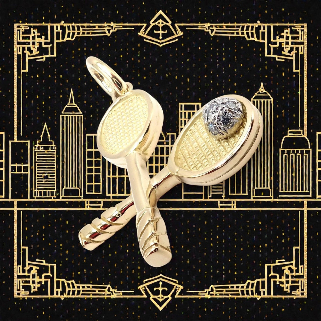 A rare vintage Tiffany & Co. charm depicting crossed tennis rackets in rich 18k yellow gold, highlighted by an 18k white gold tennis ball set with a sparkling diamond.