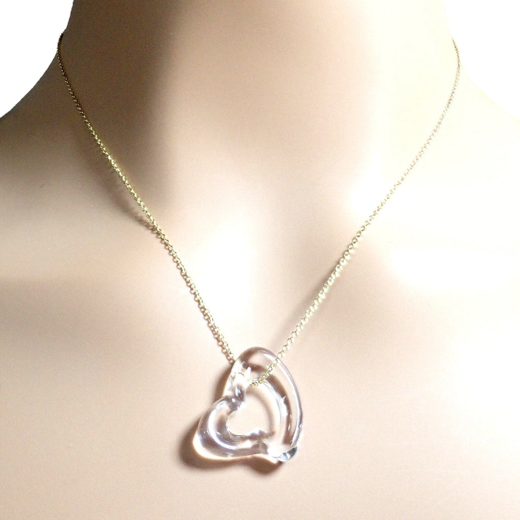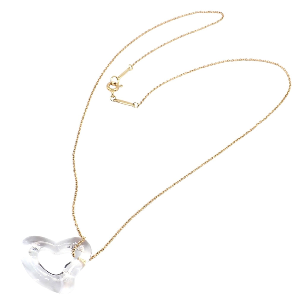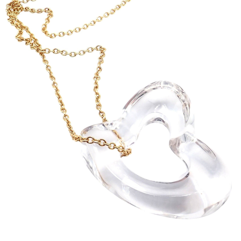 This Tiffany & Co. necklace by Elsa Peretti features a stunning large rock crystal open heart pendant and suspended from a 18k yellow gold chain.