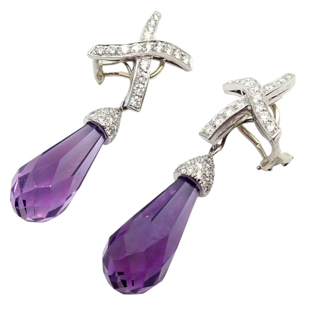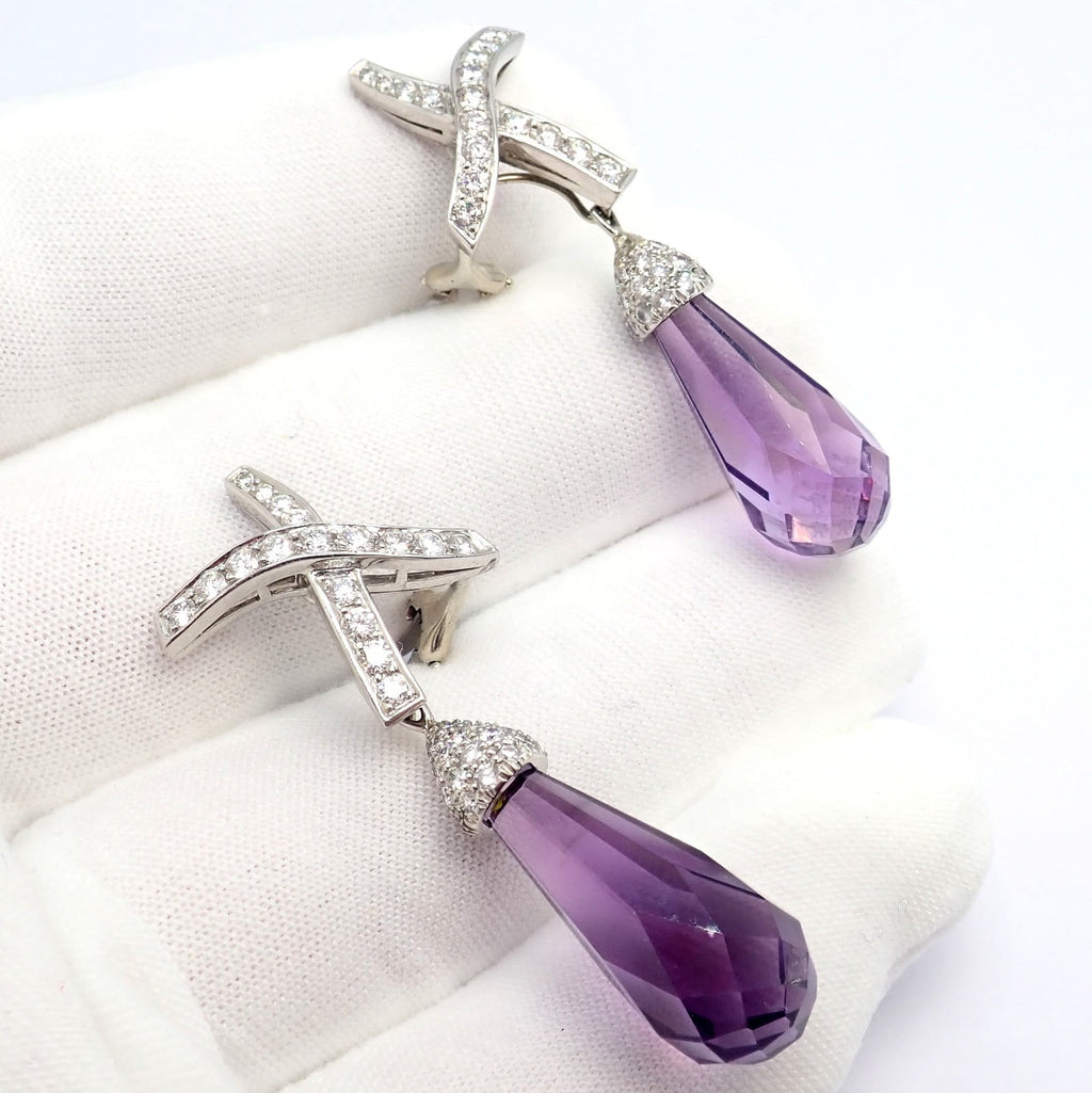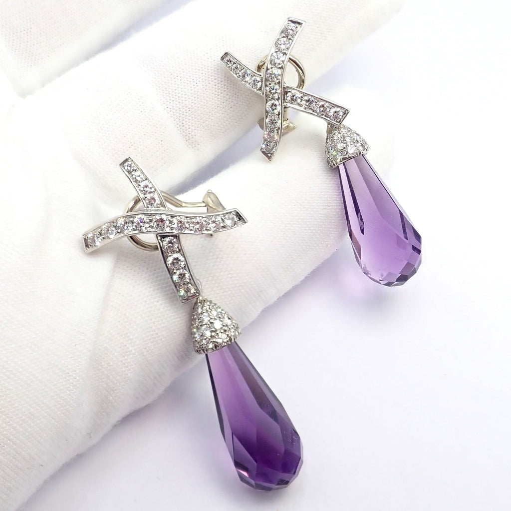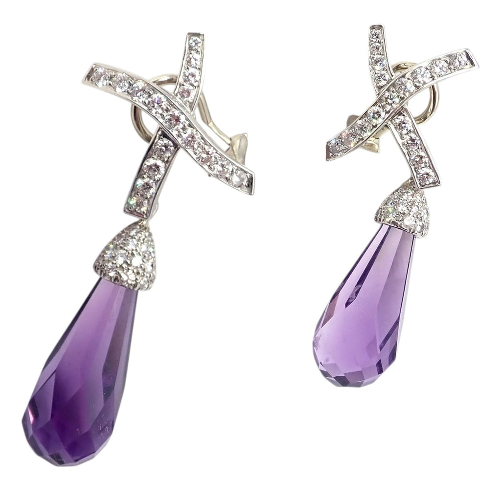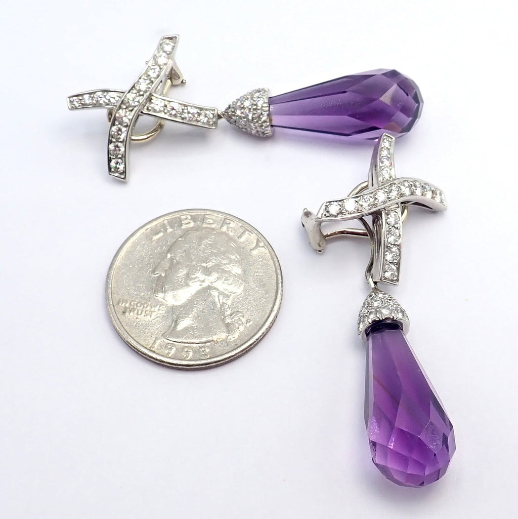 Crafted in platinum, these Tiffany & Co. Paloma Picasso X drop earrings feature pavé-set diamond X motifs suspending faceted amethyst briolettes.