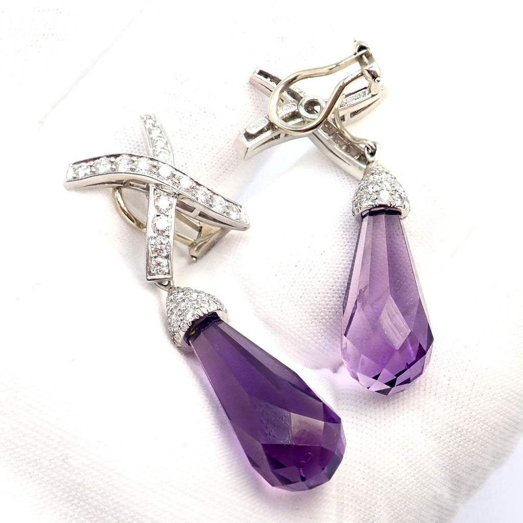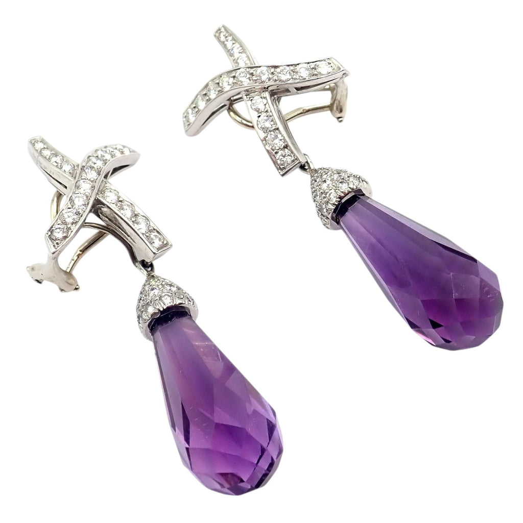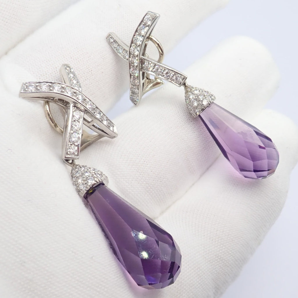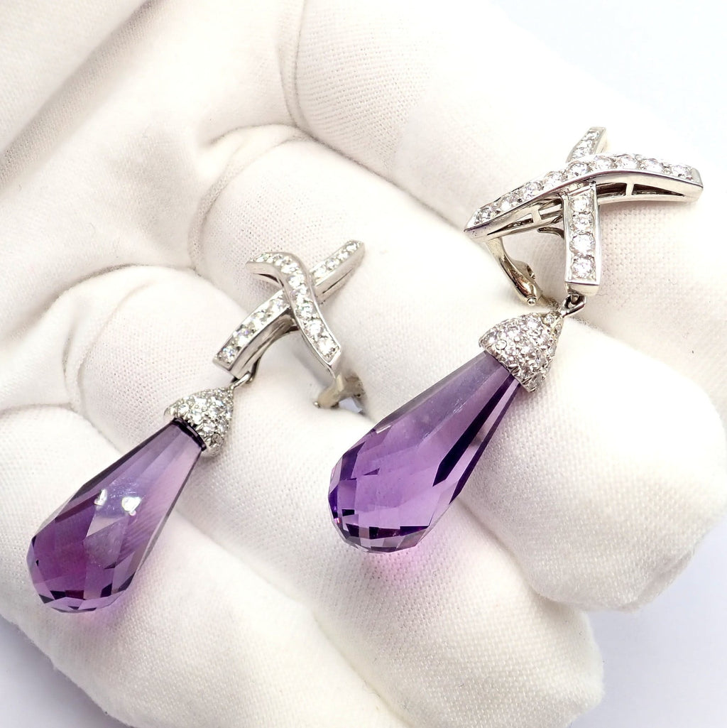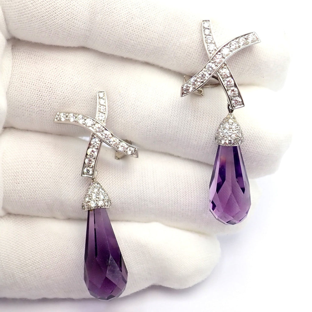 Crafted in platinum, these Tiffany & Co. Paloma Picasso X drop earrings feature pavé-set diamond X motifs suspending faceted amethyst briolettes.