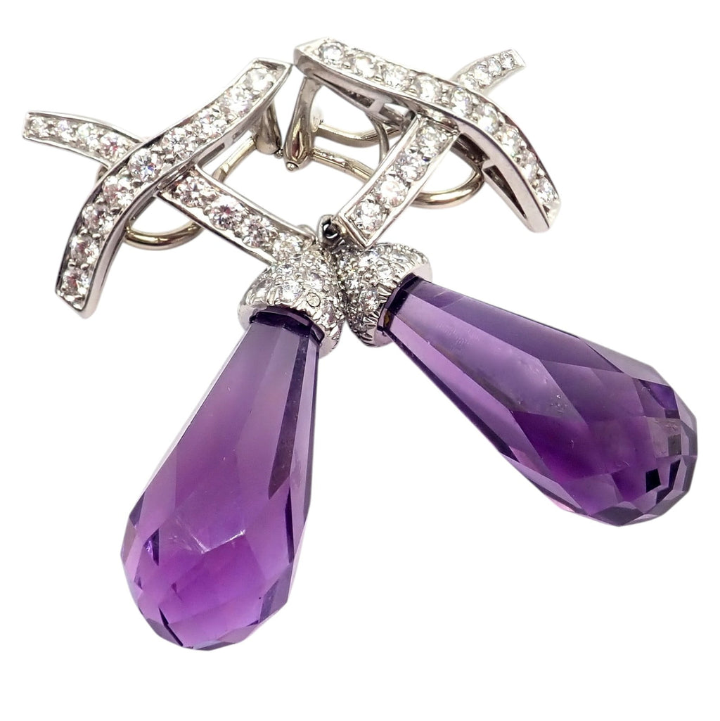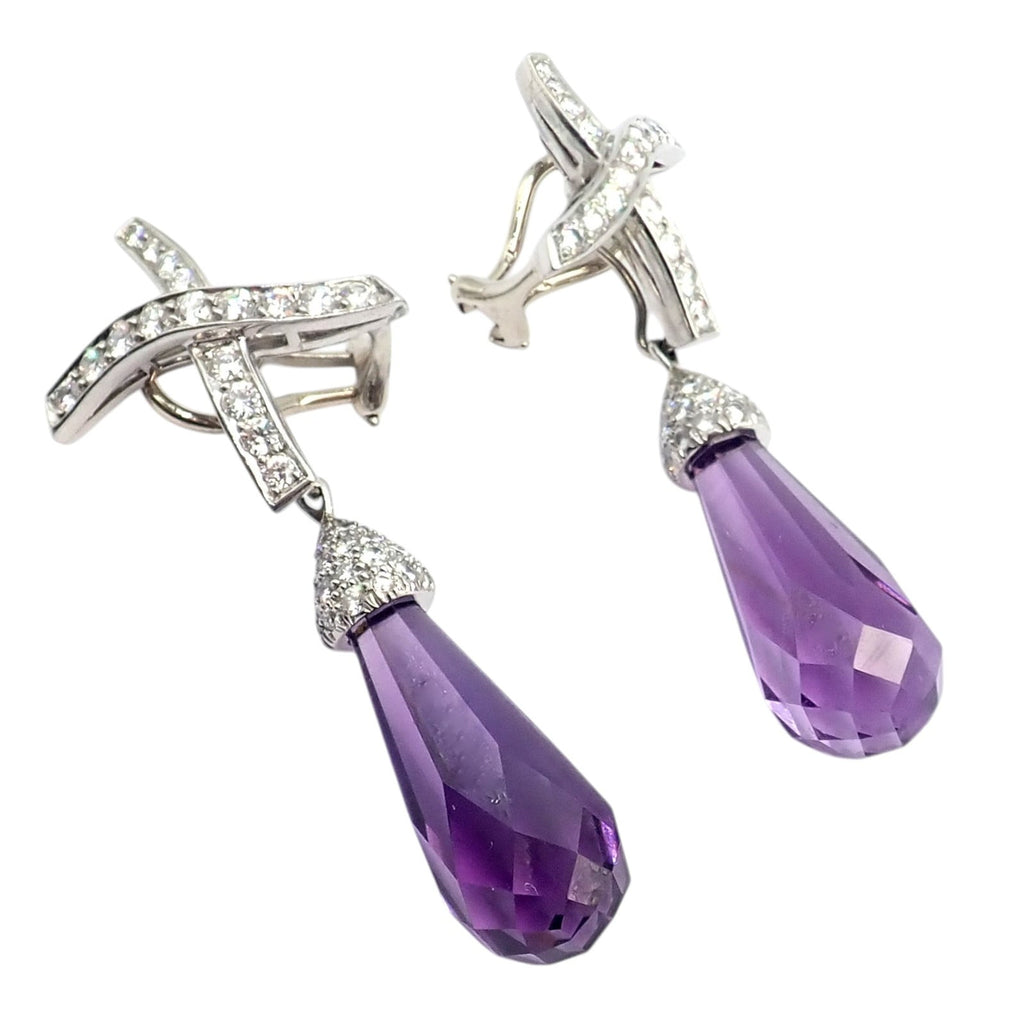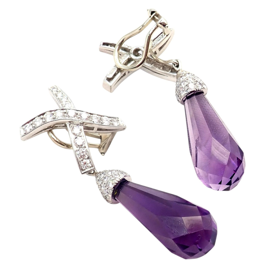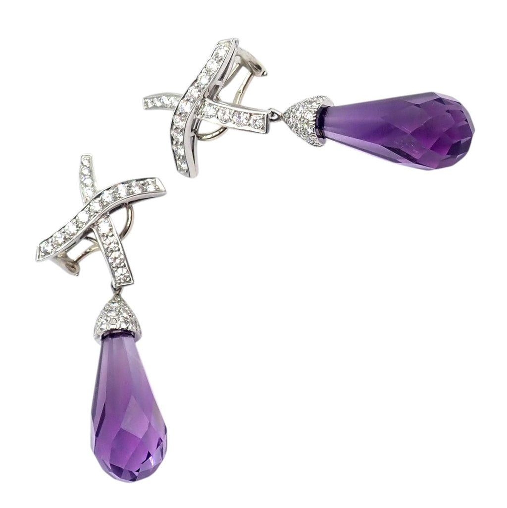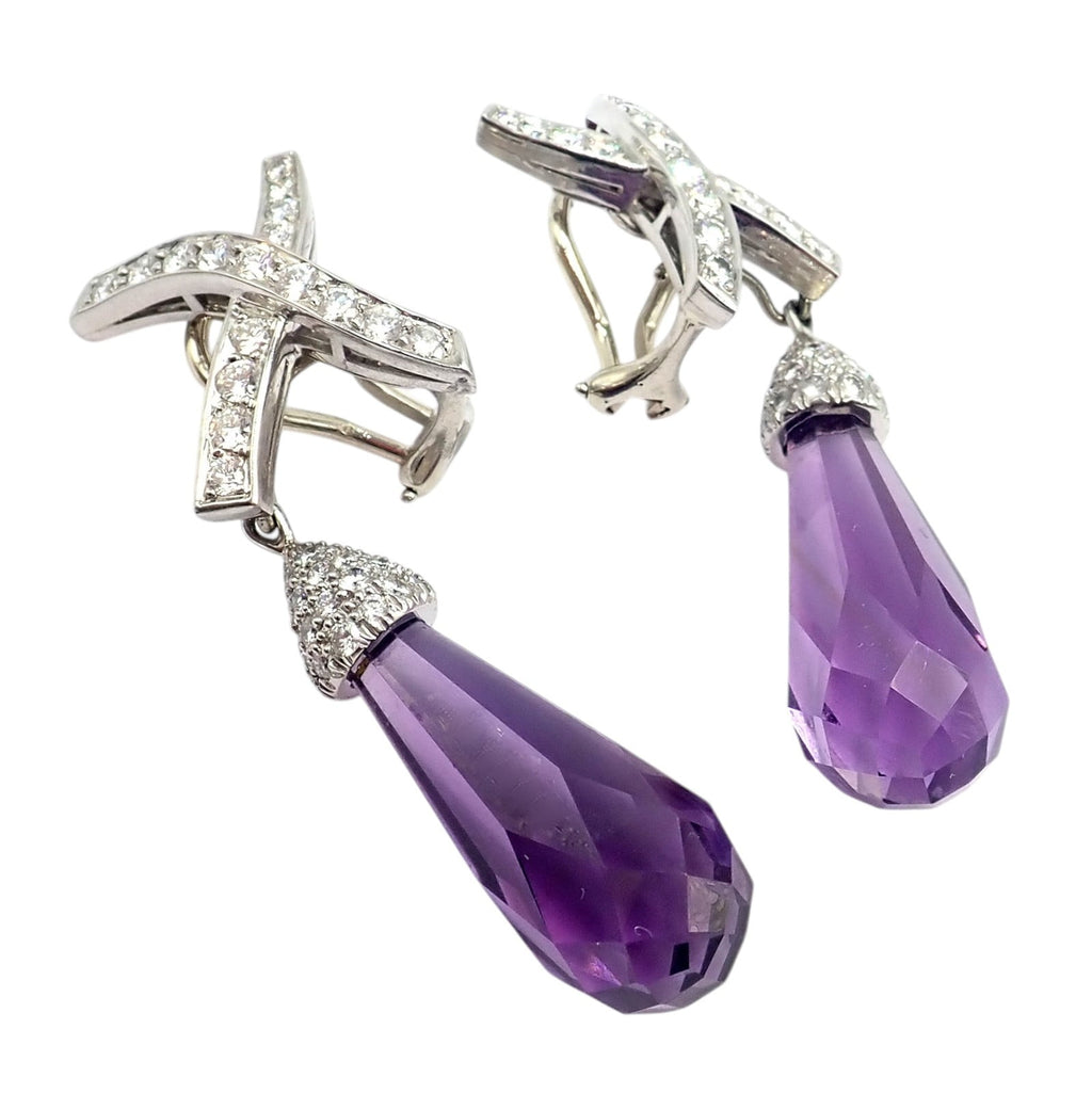 Crafted in platinum, these Tiffany & Co. Paloma Picasso X drop earrings feature pavé-set diamond X motifs suspending faceted amethyst briolettes.
