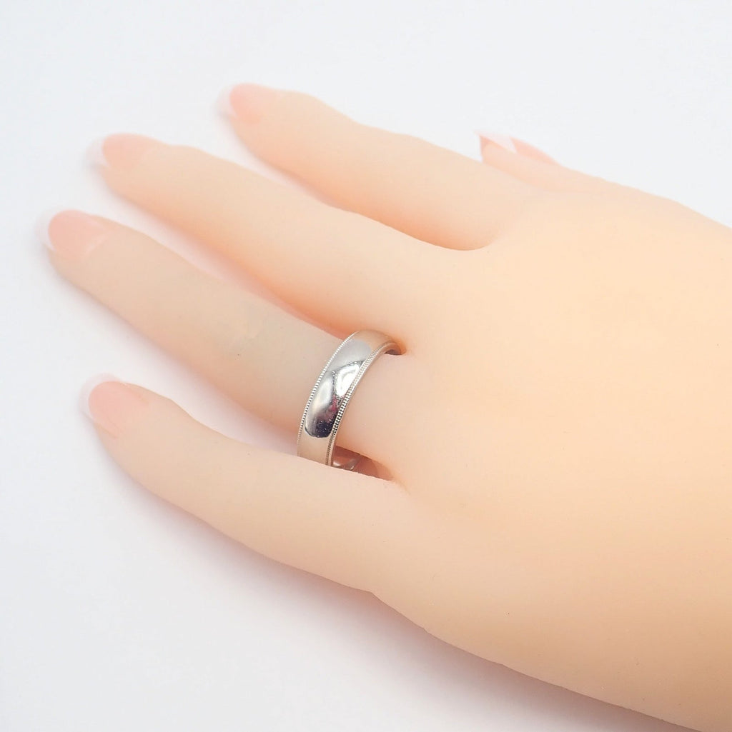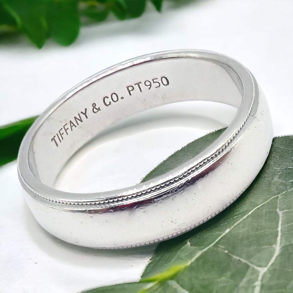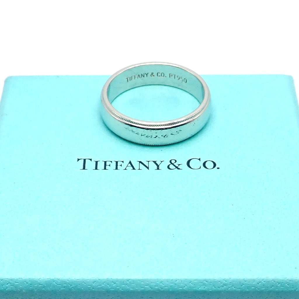 Tiffany & Co. presents a masterfully crafted band ring that merges the luxurious enduring shine of platinum. With a width of 6mm, the ring exudes understated elegance, enhanced by the classic milgrain detailing that adorns its edges. Offered in size 11.5, this piece is a perfect blend of tradition and modernity, symbolizing enduring beauty and craftsmanship.