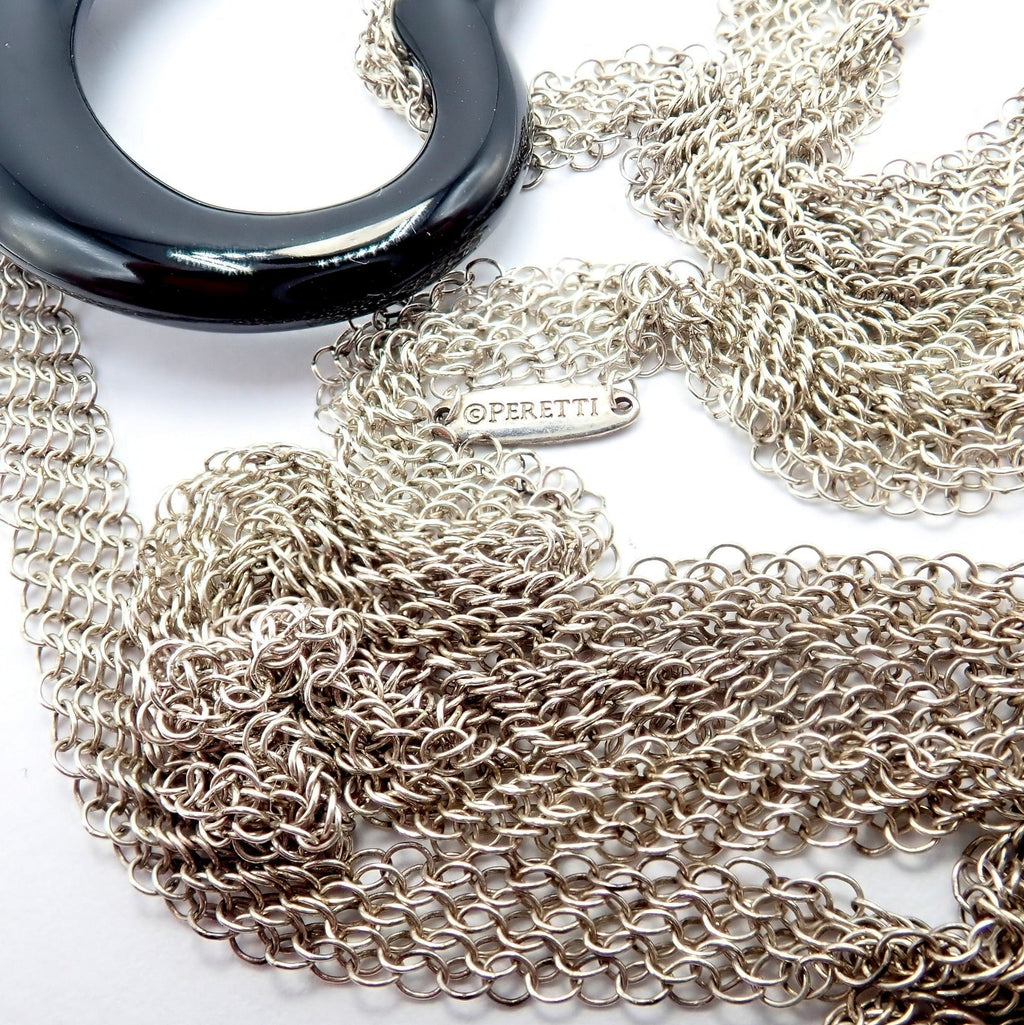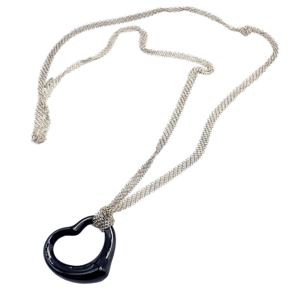 The Tiffany & Co Silver Peretti 35mm Large Open Onyx Heart Pendant on a 28" Mesh Necklace is a striking piece.