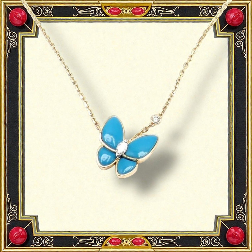Van Cleef & Arpels 18k gold butterfly pendant necklace featuring vivid turquoise wings and a sparkling diamond body.