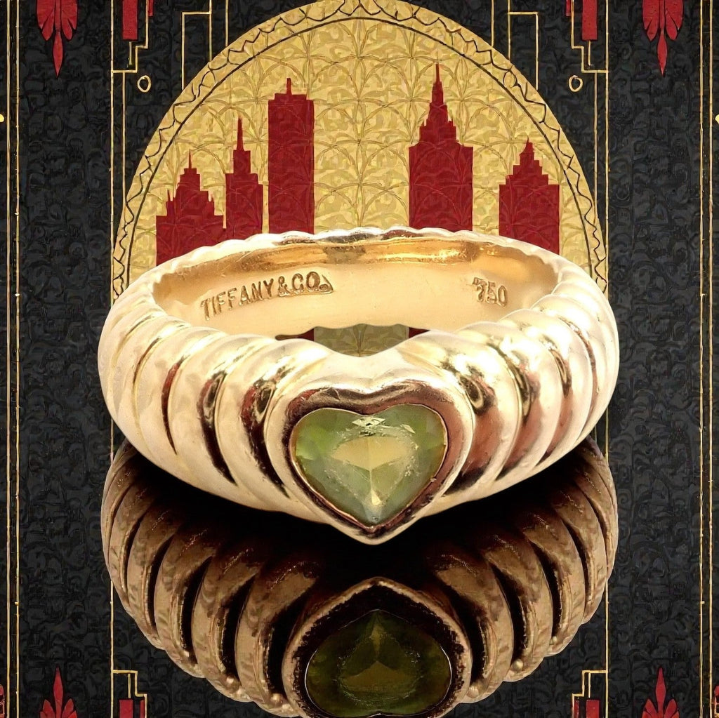 Vintage Tiffany & Co. 18k yellow gold ring featuring a scalloped, ribbed design and a heart-shaped peridot centerpiece.