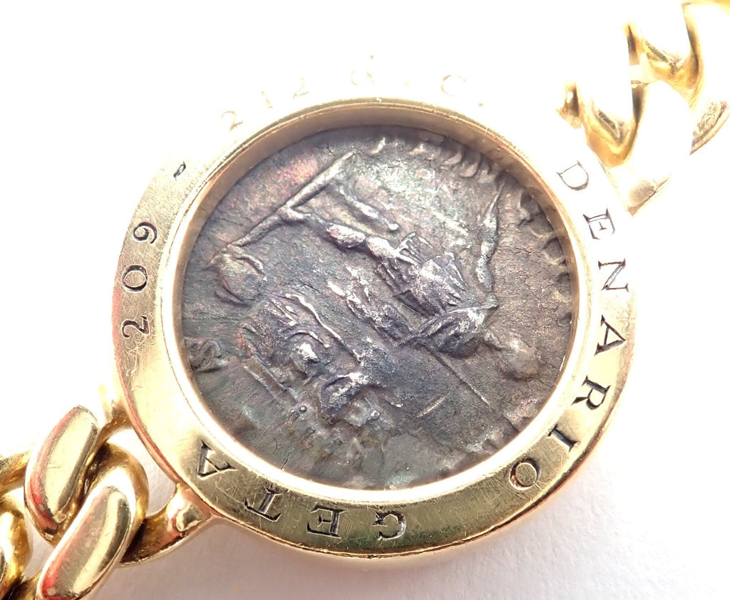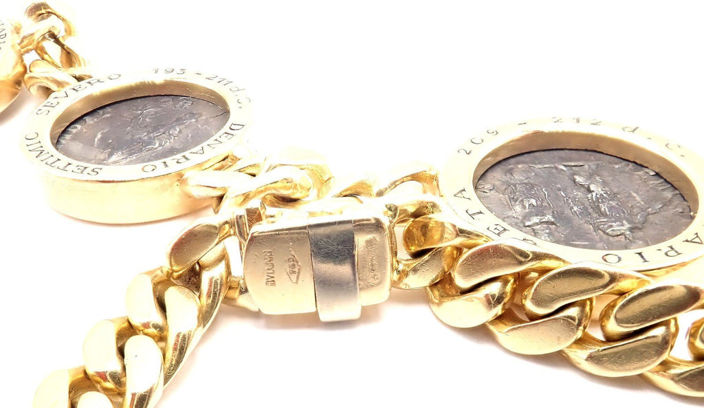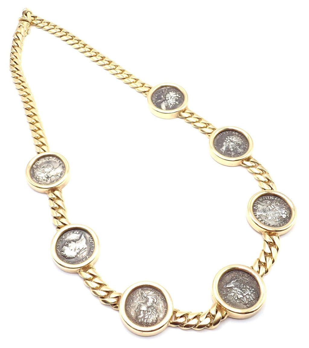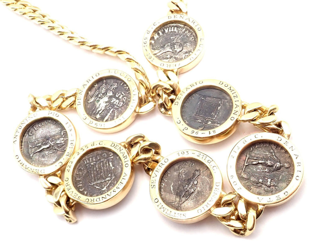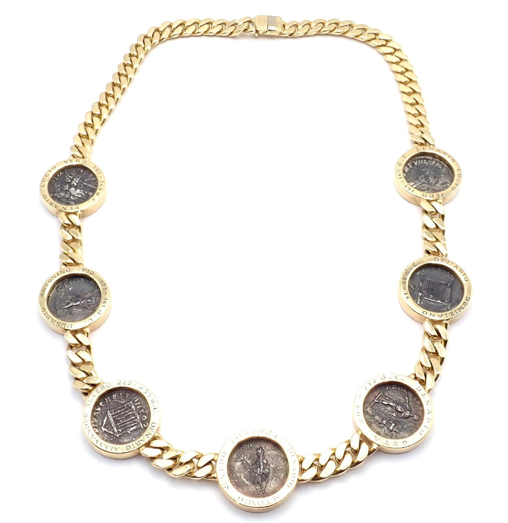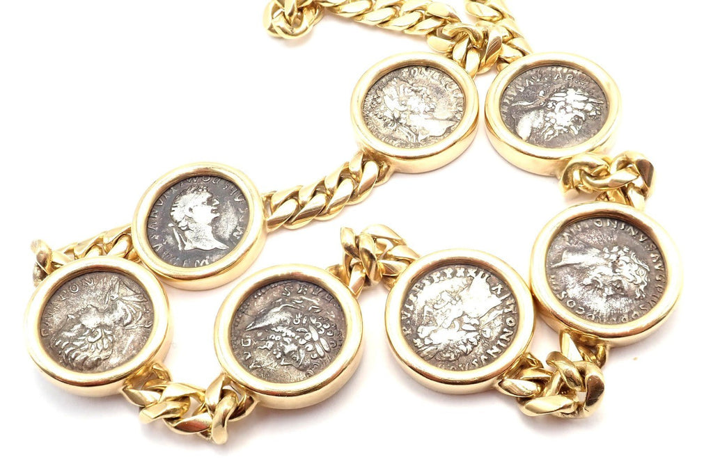 The Bvlgari 18k Yellow Gold 7 Antique Coin Monete Link Necklace showcases 7 ancient coins set within a classic gold bezel, blending history with luxury.