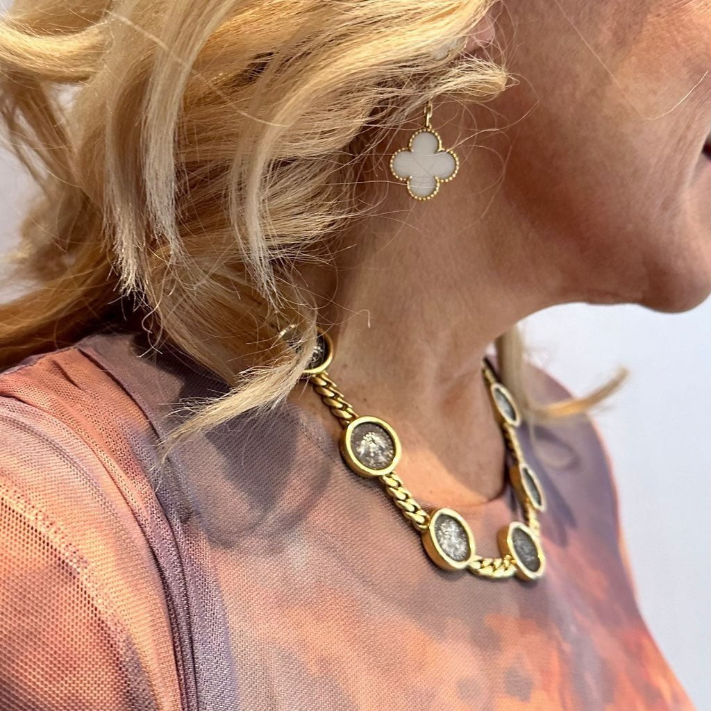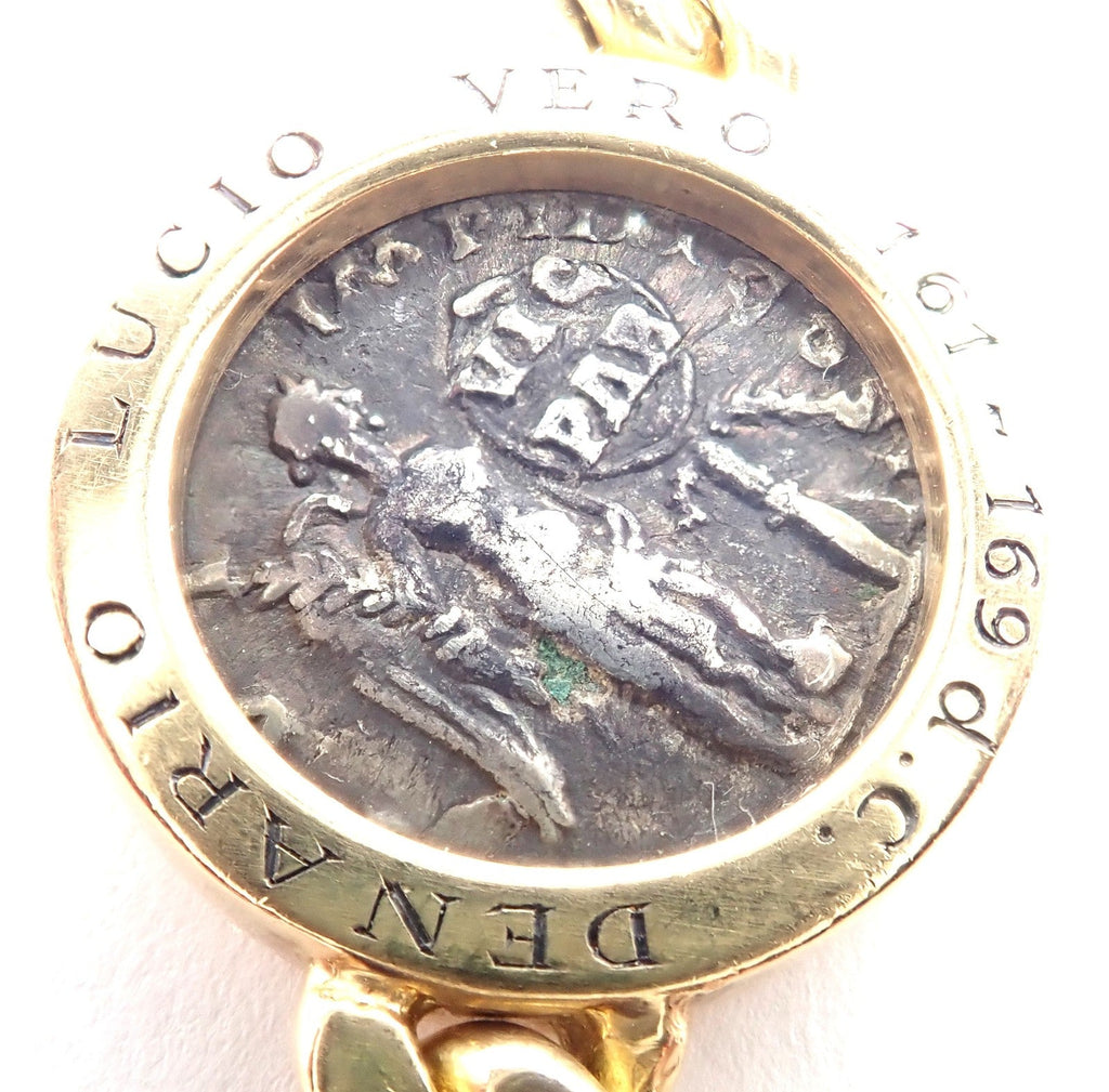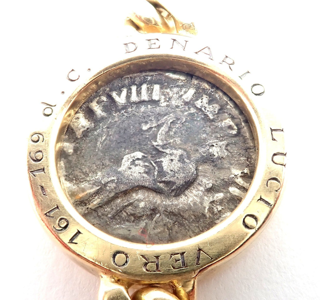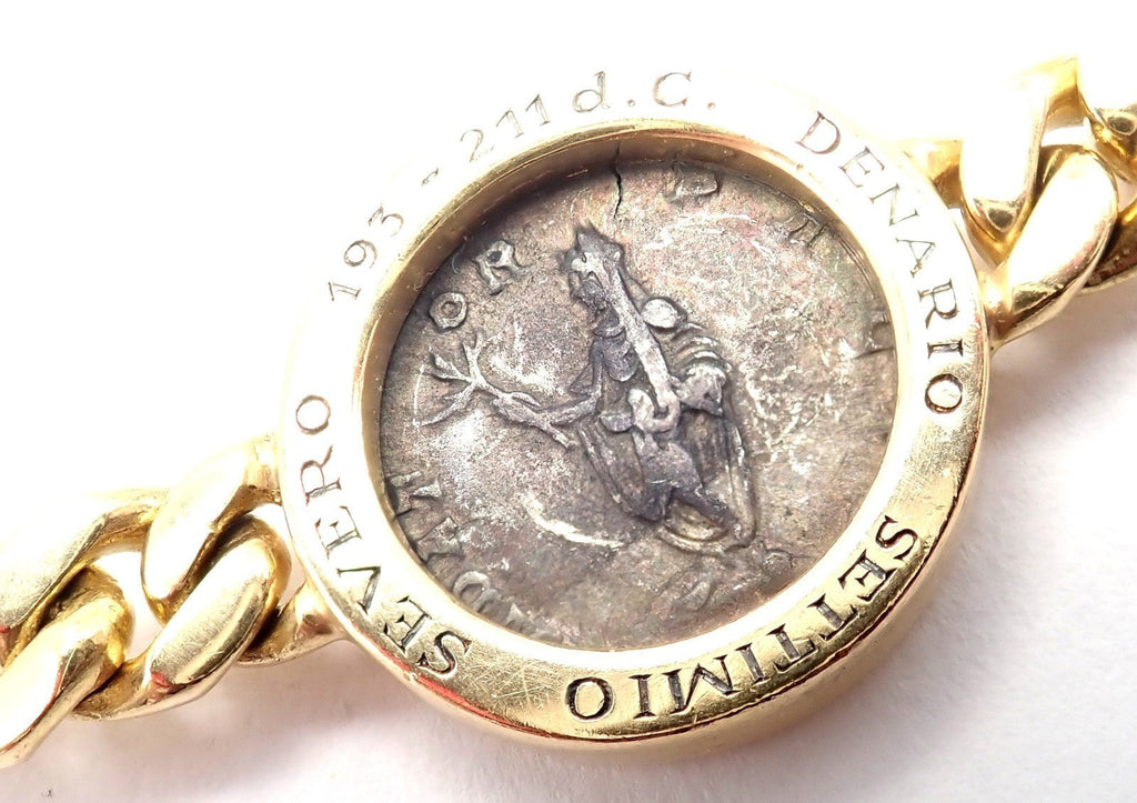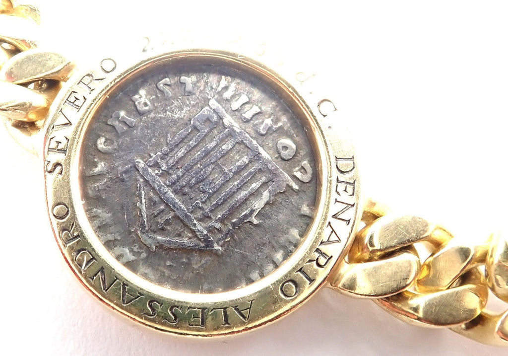 The Bvlgari 18k Yellow Gold 7 Antique Coin Monete Link Necklace showcases 7 ancient coins set within a classic gold bezel, blending history with luxury.