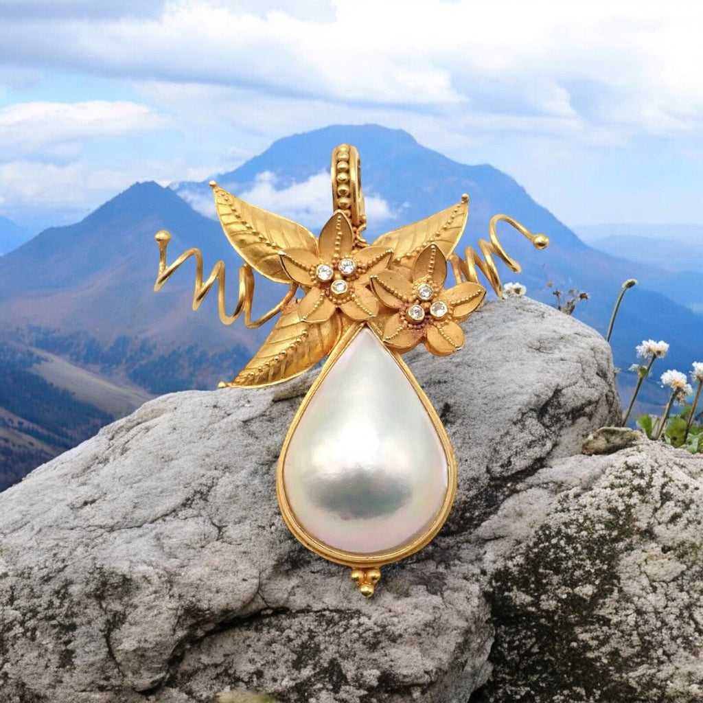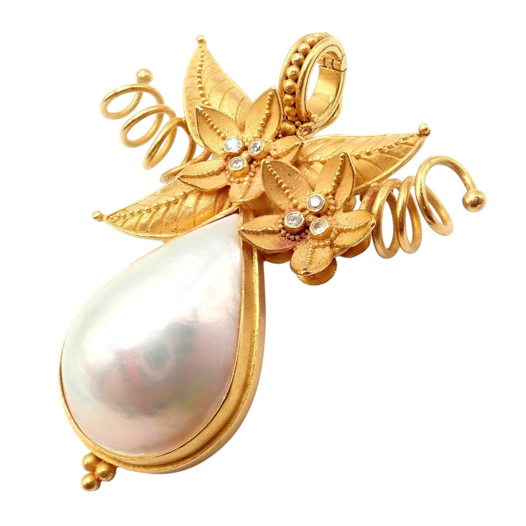 Exquisite Vintage Carolyn Tyler 22k yellow gold pendant pin featuring a luminous teardrop shaped large mabe pearl embraced by warm yellow high karat gold and glittering diamond accents.