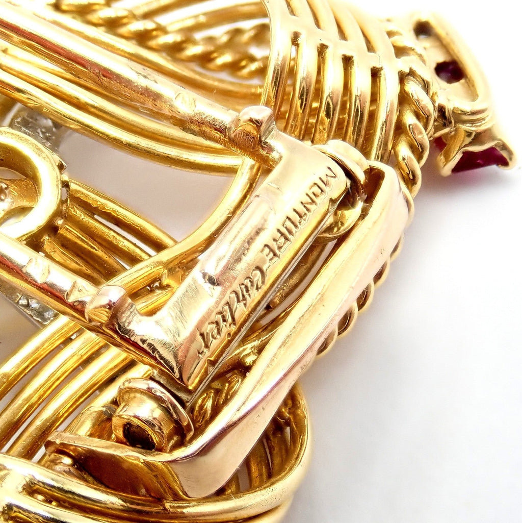 This vintage Cartier brooch, crafted in the 1960s, showcases luxurious 18k yellow gold in an intricate woven design.